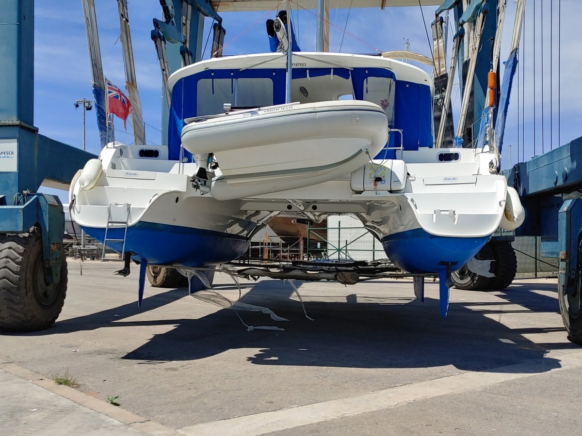 Nach dem Reinigen der Rümpfe strahlt das blaue Antifouling fast wieder wie neu und der Gutachter kann mit seiner Arbeit beginnen.