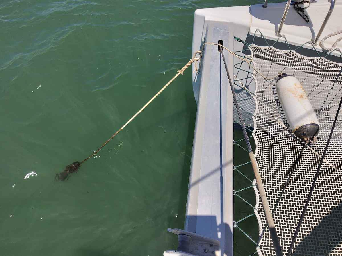 Um es kurz zu machen, es hat eine Weile gedauert (etwa 10 Anläufe), bis ich es geschafft habe vom Steuerstand nach vorne zu gehen und die Bojen mit dem Haken im Wasser zu erreichen, bevor mich der Wind wieder abgetrieben hat.