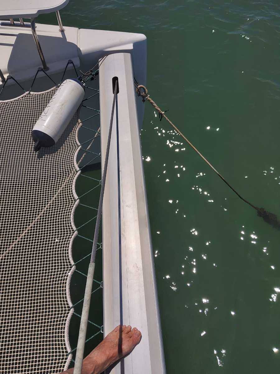 Die Mooring sind in diesem Fall zwei Taue (weil Katamaran, zwei Rümpfe), deren eine Enden unter Wasser verankert sind und die ich mit deren freien Enden am Bug (das ist vorne) wieder befestigen muß. Die freien Enden schwimmen im Wasser und sind an Bojen befestigt, die ich mit dem Bootshaken auffischen muß. Erschwerend kommt noch hinzu, daß zwischenzeitlich der Wind aufgefrischt hat und ganz ordentlich über Deck bläst.