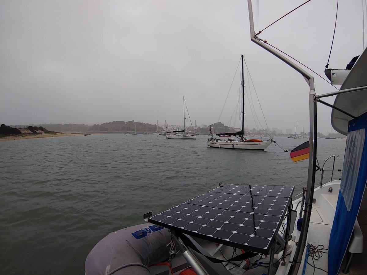 Da gestern wie vorhergesagt ein Regentag war, gänzlich ohne Sonne, war es nicht nur feucht, sondern auch kalt. Sehr ungemütlich. Ich bin den ganzen Tag nicht vor die Tür. Bei dem vielen Regen war es wichtig den Dichtstopfen am Dinghi herauszunehmen. Aus dem Wasserauslauf kann dann der Regen abfließen. Jeder der beiden Davids kann 100 kg Last aufnehmen. Das Schlauchboot und die Solarpaneelen dürften geschätzt etwa 70 kg wiegen, also etwa 35 kg an jedem David. Da der Außenborder 42 kg wiegt und praktisch nur vom Backbord-David getragen wird, ist dessen Last mit etwa 75 kg schon recht hoch. Viel Wasser darf da das Dinghi nicht aufnehmen.