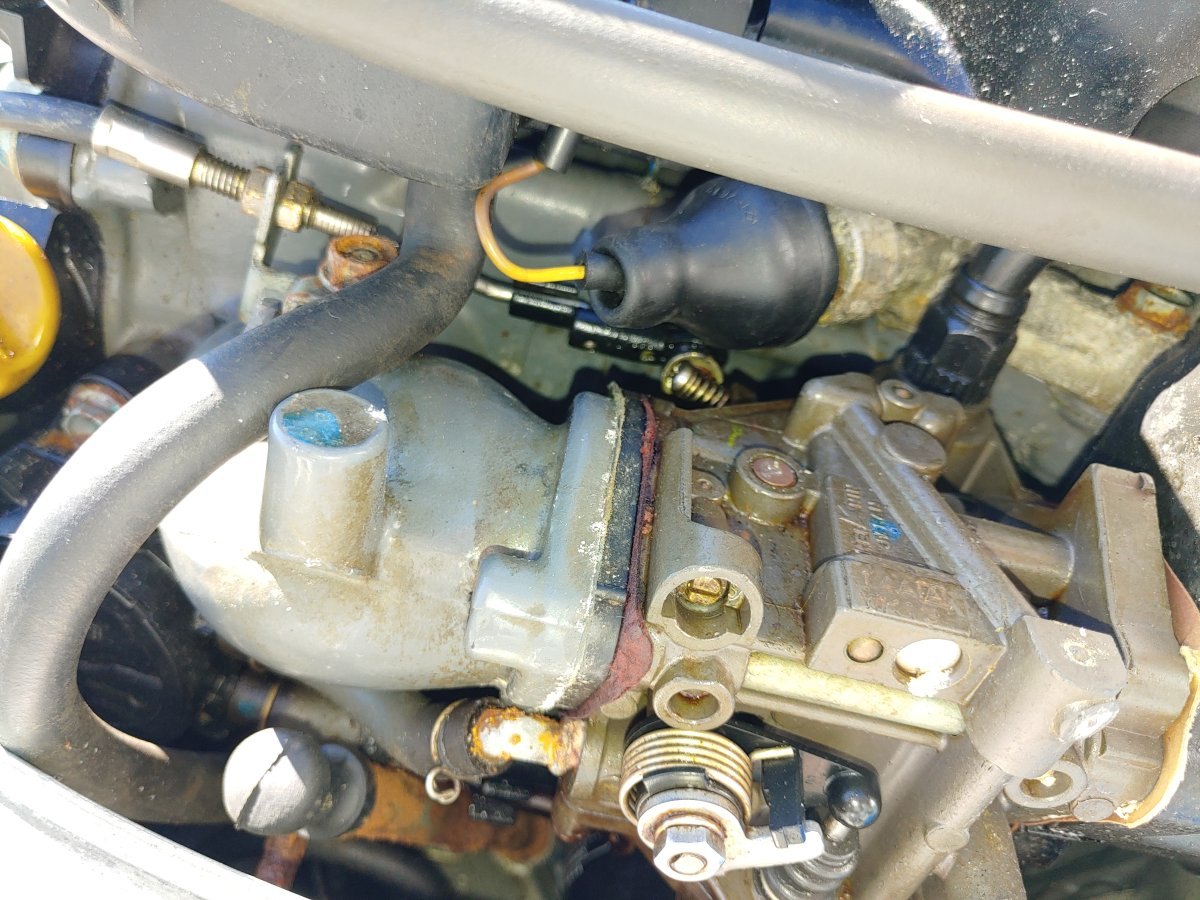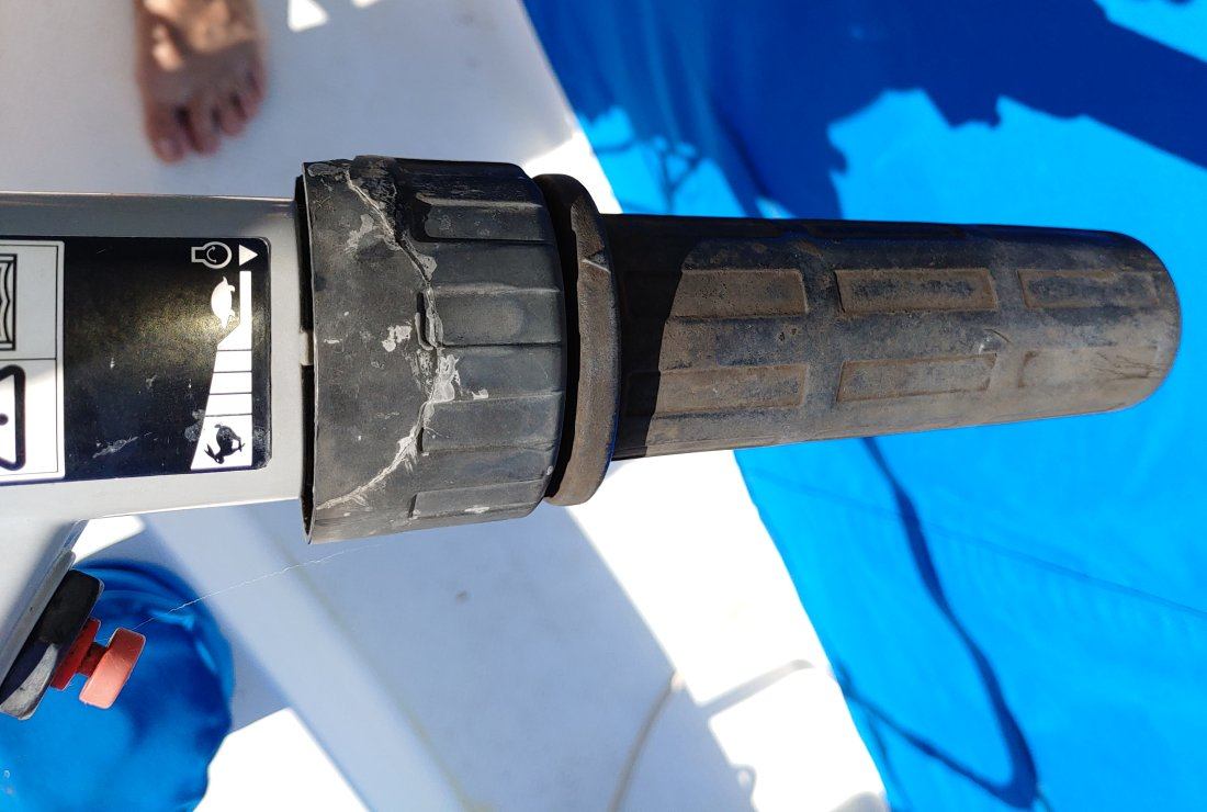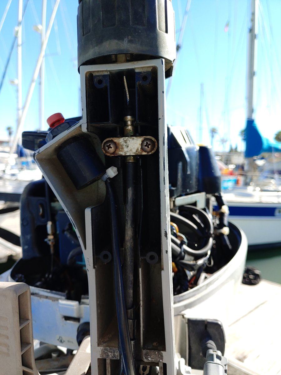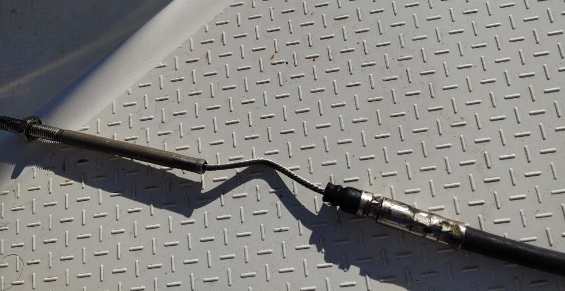 Um den Außenbordmotor reparieren zu können, wird er erst einmal an Bord gehievt und an der dafür vorgesehenen Halterung befestigt. Durch die Hilfe eines freundlichen Nachbarn und meinem kleinen Flaschenzug ging das leichter als gedacht, trotz der 42 kg. Ich hatte es ja schon erwähnt, der Gaszug ist eigentlich kein Zug, sondern wird wie eine Schubstange verwendet. Wenn man Gas gibt, wird der Gaszug nach vorne geschoben und bedient so die Drosselklappe am Vergaser. Eine blöde Konstruktion! Am alten, ausgebauten Gaszug sieht man auch sofort warum. Wenn die Drosselklappe mal etwas schwergängiger ist, wird das Stahlseil des Gaszuges geknickt. Das ist dann nicht mehr zu korrigieren und ein neuer Zug muß eingebaut werden. Das einzig positive, der Ausbau und auch der Einbau sind nicht sehr schwierig. Nur die Einstellung der richtigen Längenverhältnisse über die Stellschrauben hat etwas länger gedauert.