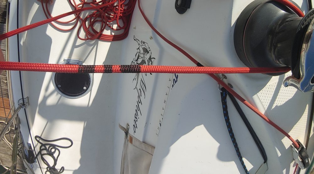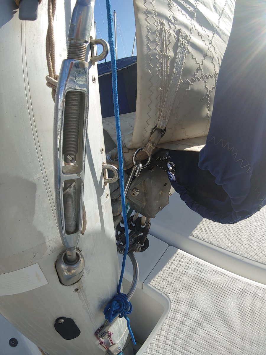 Heute waren die Wolken zwar noch nicht vollständig verschwunden, aber zumindest zeitweise kam die Sonne zum Vorschein. Zeit genug und wenig genug Wind um das Großsegel auszupacken und hochzuziehen. Da ich alleine unterwegs bin, ist es schon schwer genug, die Segel zu reffen. Da will ich es mir wenigstens dadurch vereinfachen, daß ich am Großfall (die Leine, an der das Großsegel hängt) die Position der einzelnen Reffs markiere. Bis zu den Markierungen muß ich dann das Segel ablassen um die Reffs einlegen zu können. Das ist vorne am Mast besonders schwierig, denn hier muß ein Stahlring eingehakt werden und der Spielraum dafür ist sehr eng. Das zusammengefaltete Segel steht dem einfach im Wege. Hinten wird das Reff über Leinen eingelegt und mit diesen dann das Unterliek (die Unterseite) des Segels wieder gespannt. Besonders unangenehm dabei ist, daß man vor an den Mast muß. Reffen tut man eben nur, wenn zu viel Wind ist. Viel Wind bedeutet aber meist auch unruhige See und unfreundliches Wetter, nicht die Verhältnisse in denen man gerne den Schutz am Steuerstand verläßt. Ein falscher Schritt oder eine Welle zum ungünstigen Zeitpunkt und man verliert den Halt oder schlimmeres.