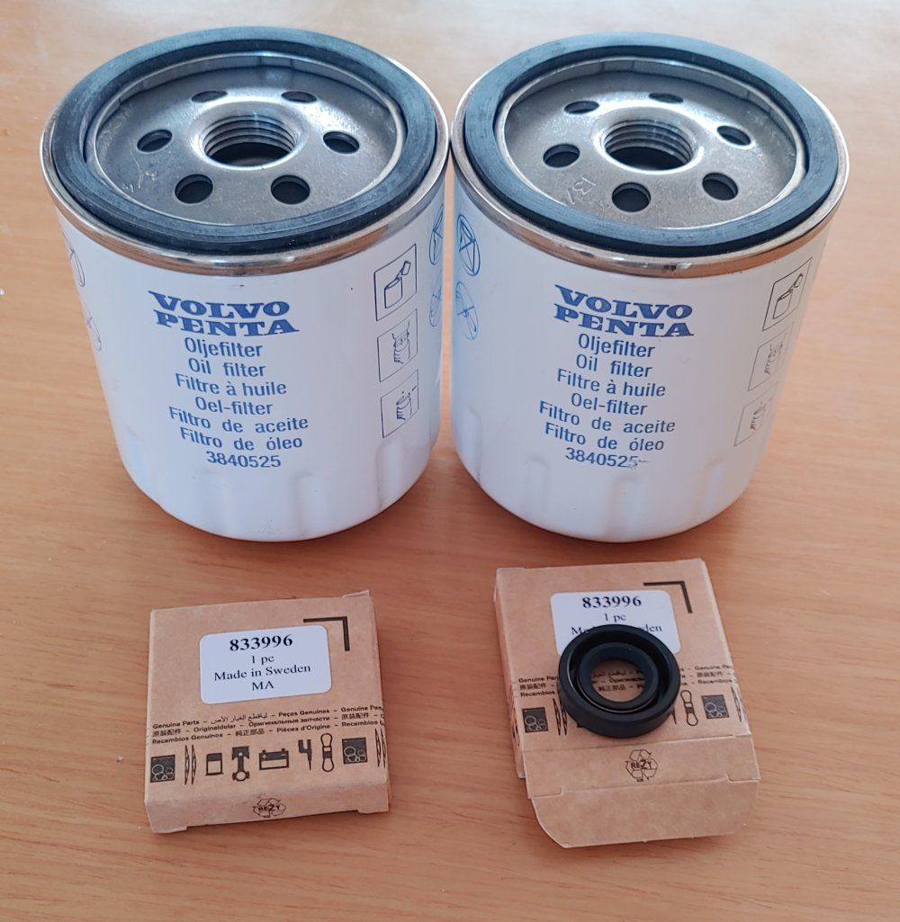 Auch die Ölfilter werde ich nicht tauschen, sondern nur das Öl. Die montierten Filter sind nicht die für diese Maschinen vorgesehenen, sondern größere, auch von Volvo Penta. Da die größeren Filter auch länger halten, lasse ich die auch bis zum Herbst drin.