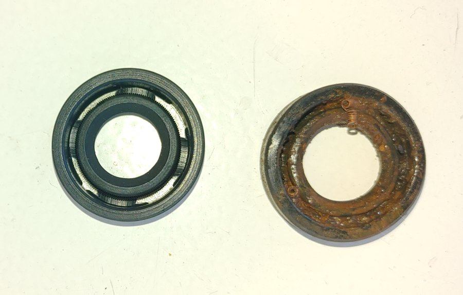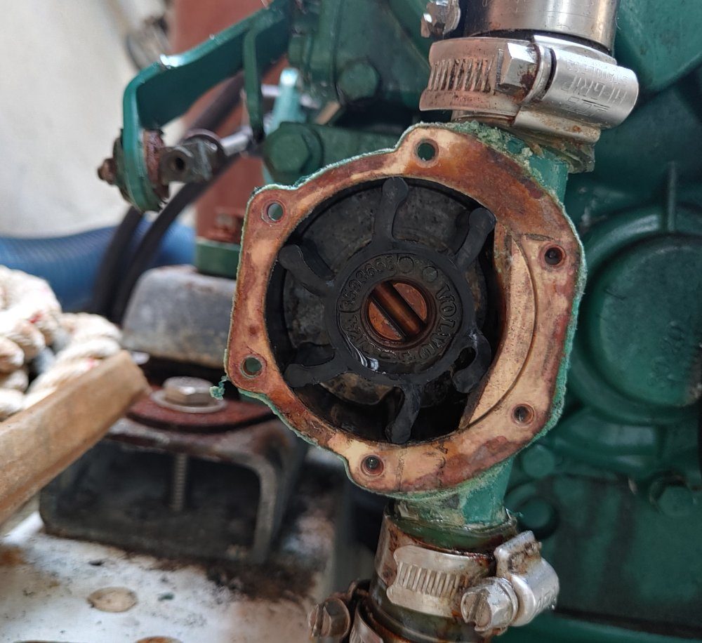 Inzwischen habe ich den Dichtungsring und den Impeller an der Steuerbordmaschine ausgetauscht. Während der Impeller noch in Ordnung war und weiterhin als Ersatzteil an Bord bleibt, war der Dichtungsring längst überfällig. Man kann deutlich sehen, daß die Feder im Inneren bereits gebrochen ist. Ich habe darüber nachgedacht an der Backbordmaschine die Teile auch auszutauschen, es dann aber verschoben. Der Impeller war noch einwandfrei und ich gehe davon aus, daß er auf Backbord auch in Ordnung ist. Die Bilge dort ist trocken, also ist der Dichtungsring auch noch OK. Im Herbst kommt das Boot sowieso in Portimao an Land, um die Unterwasserrümpfe neu mit Antifouling zu versehen. Ich hoffe bis dahin hält das und dann tausche ich die Teile aus. Falls nicht, habe ich ja nun das Ersatzteil an Bord.