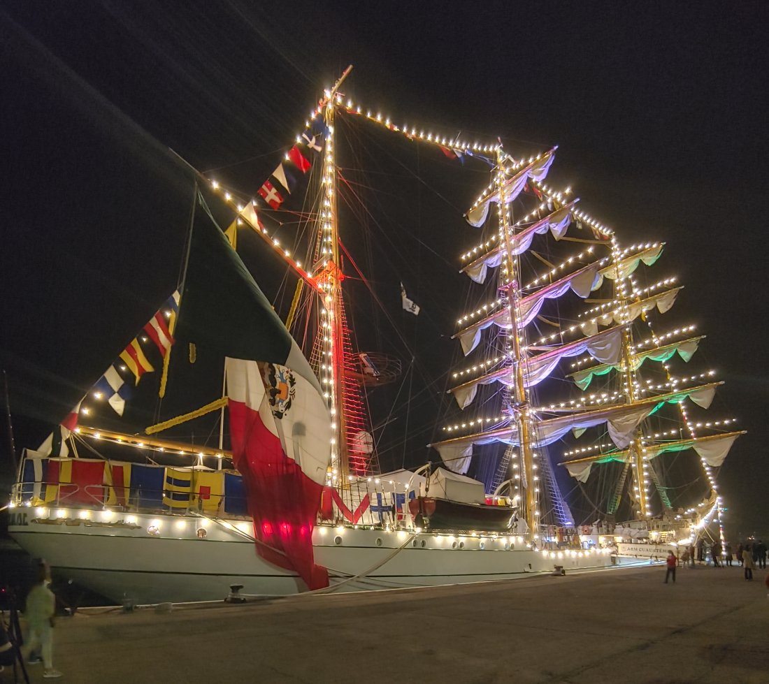 Angekommen ist wieder ein Segelschulschiff, diesmal aus Mexiko, die Cuauhtémoc. Sie trägt den Namen des letzten aztekischen Herrschers, Kaiser Cuauhtémoc, der 1525 von den Spaniern gefangen genommen und hingerichtet wurde. Anders als die Gorch Fock, an derselben Stelle gelegen, still und leise, veranstaltenden die Mexikaner einen riesen Zirkus mit Flaggen und lauter Musik.