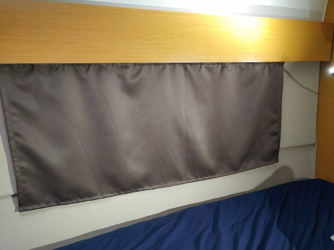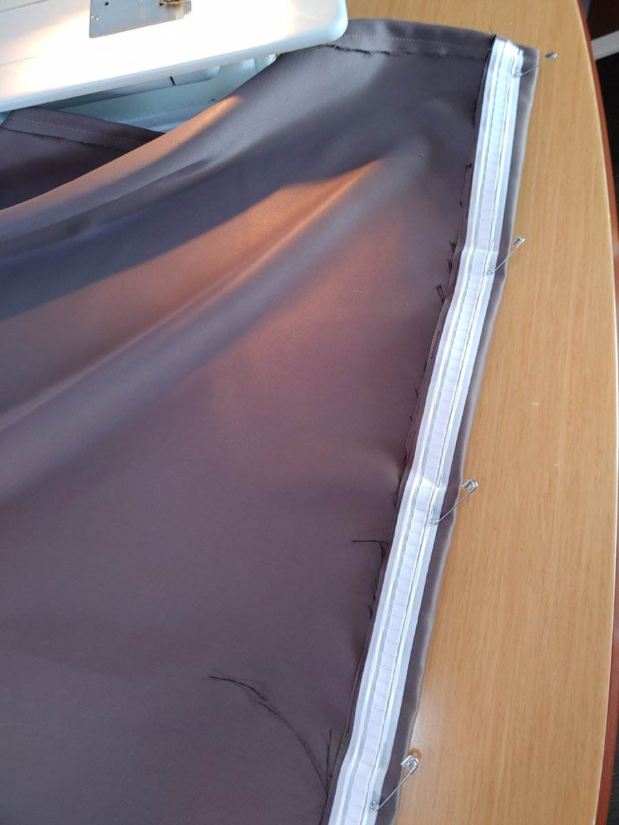 Bei dem Wetter macht es eh keinen Sinn an Land zu gehen. Stattdessen nähe ich meine Vorhänge für meine und die Gästekabine. Die alten sind nicht kaputt oder schmutzig, sie lassen nur zu viel Licht durch. Der Stoff ist einfach zu lichtdurchlässig und bei den kleinen Vorhängen am Heckfenster kommt hinzu, daß sie zu weit vom Fenster weg sind. Der Stoff, den ich gekauft habe, läßt kein Licht durch und so muß ich die Vorhänge an den Seitenfenstern nur in der gleichen Größe nachnähen. Die Vorhänge der Heckfenster mache ich ein ganzes Stück größer, so kann ich sie mit Klettband am unteren Rand fixieren und damit das Fenster komplett abdecken. Das Zuschneiden ist ein wenig schwierig, weil der Stoff riesig ist im Vergleich zu meinem kleinen Tisch. Ich kann den Stoff in der vorgesehenen Größe nicht komplett auf dem Tisch ausbreiten und so sind die rechten Winkel und Maße eher geschätzt als gemessen.