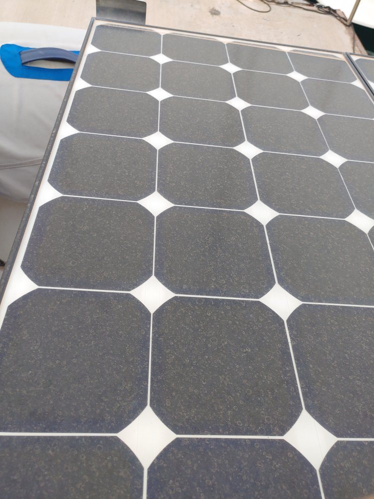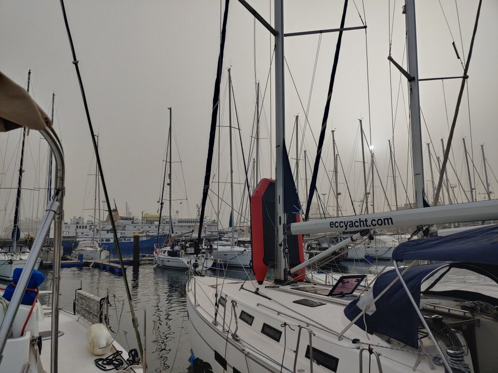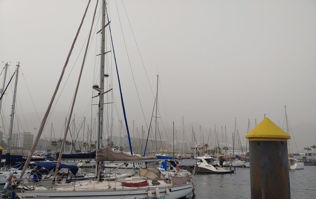 Gestern kam erschwerend hinzu, daß die Luft mit Sand angefüllt war. Sand aus der Sahara, der mit dem Calima von Osten kam und die Regierung hier auf der Insel zu einer Warnung vor zu viel Aktivität im Freien genötigt hat. Heute kann man die Ablagerungen überall sehen. Da ich morgen wohl eh meinen Wasserschlauch anschließen muß, um meinen Tank wieder aufzufüllen, werde ich wohl auch das Boot mal abspritzen.