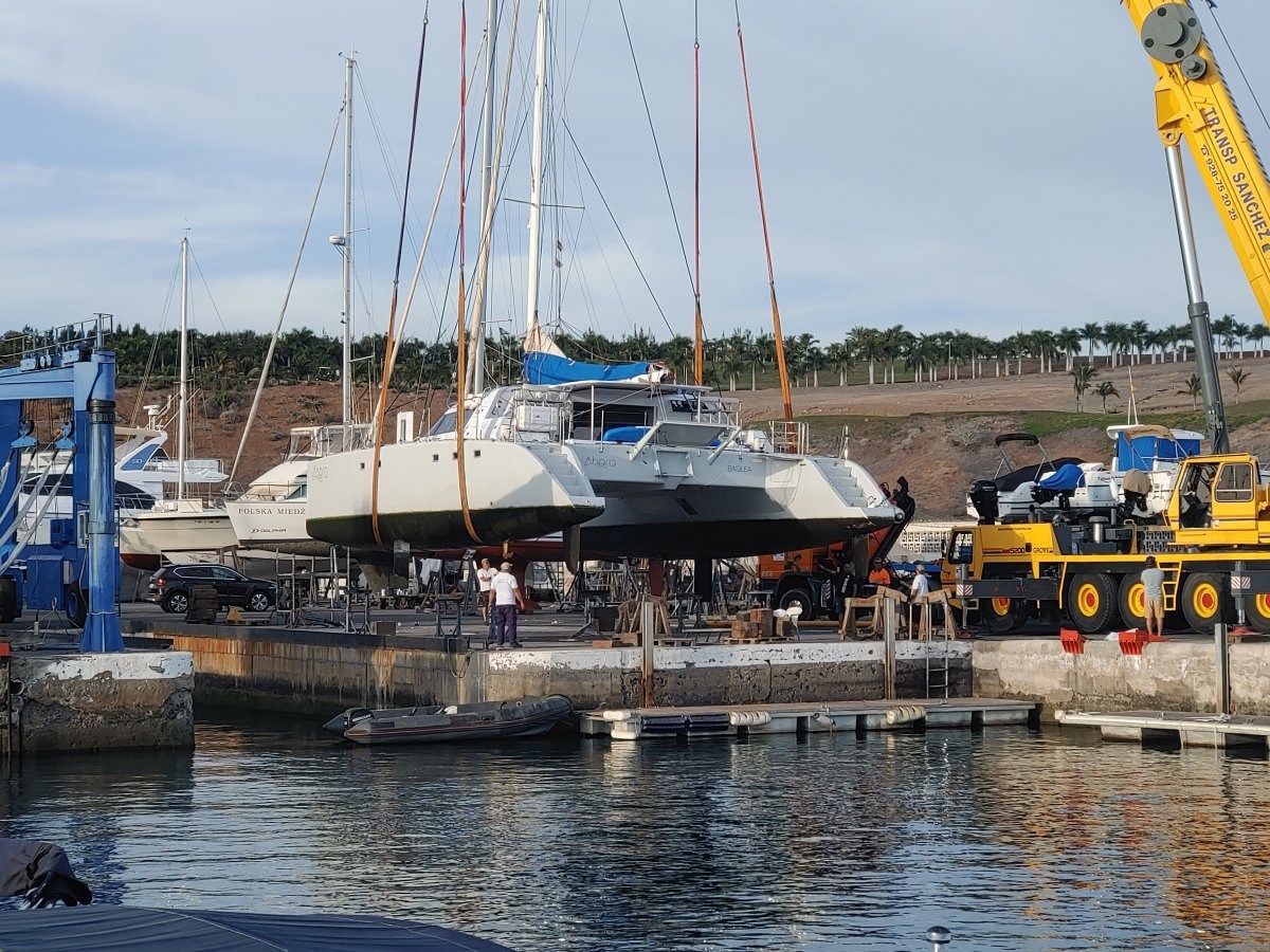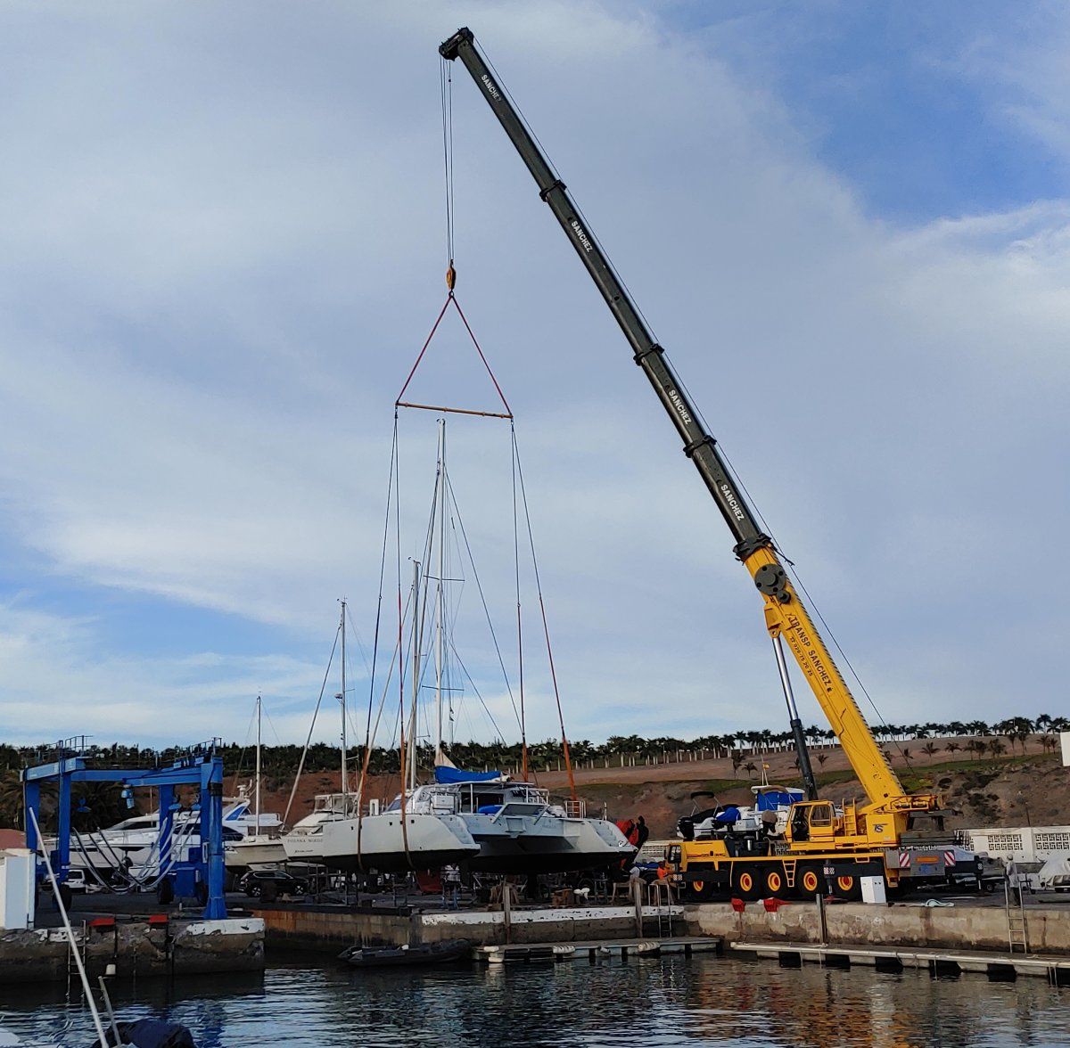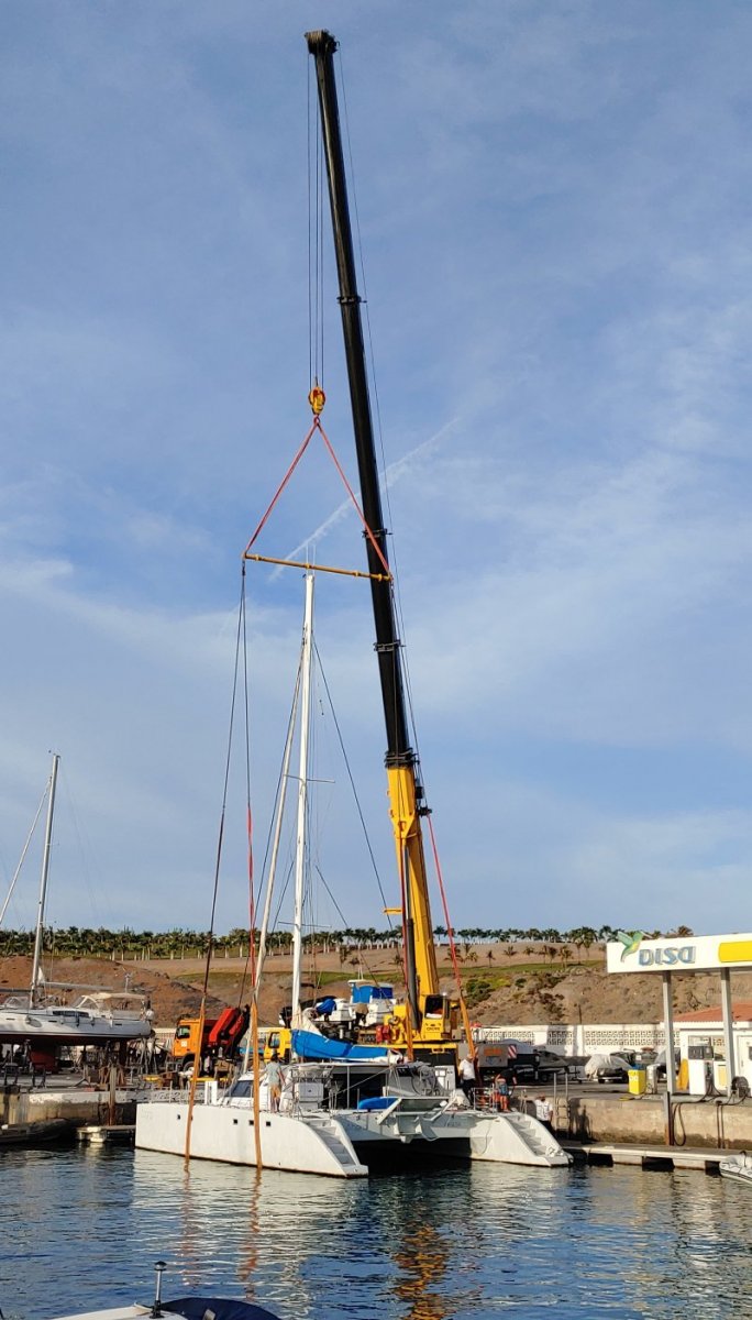 Bei der Werft gab es ein kleines Schauspiel zu bewundern, denn es wurde ein großer Katamaran aus dem Wasser gehoben, der für den vorhandenen Travellift viel zu groß war. Dazu wurde extra ein Autokran positioniert und bis die Hebeschlingen angebracht waren, ging einige Zeit ins Land. Das Heben selbst war dann recht schnell erledigt, aber das Absetzen auf die Lagerböcke hat auch wieder recht lange gedauert.