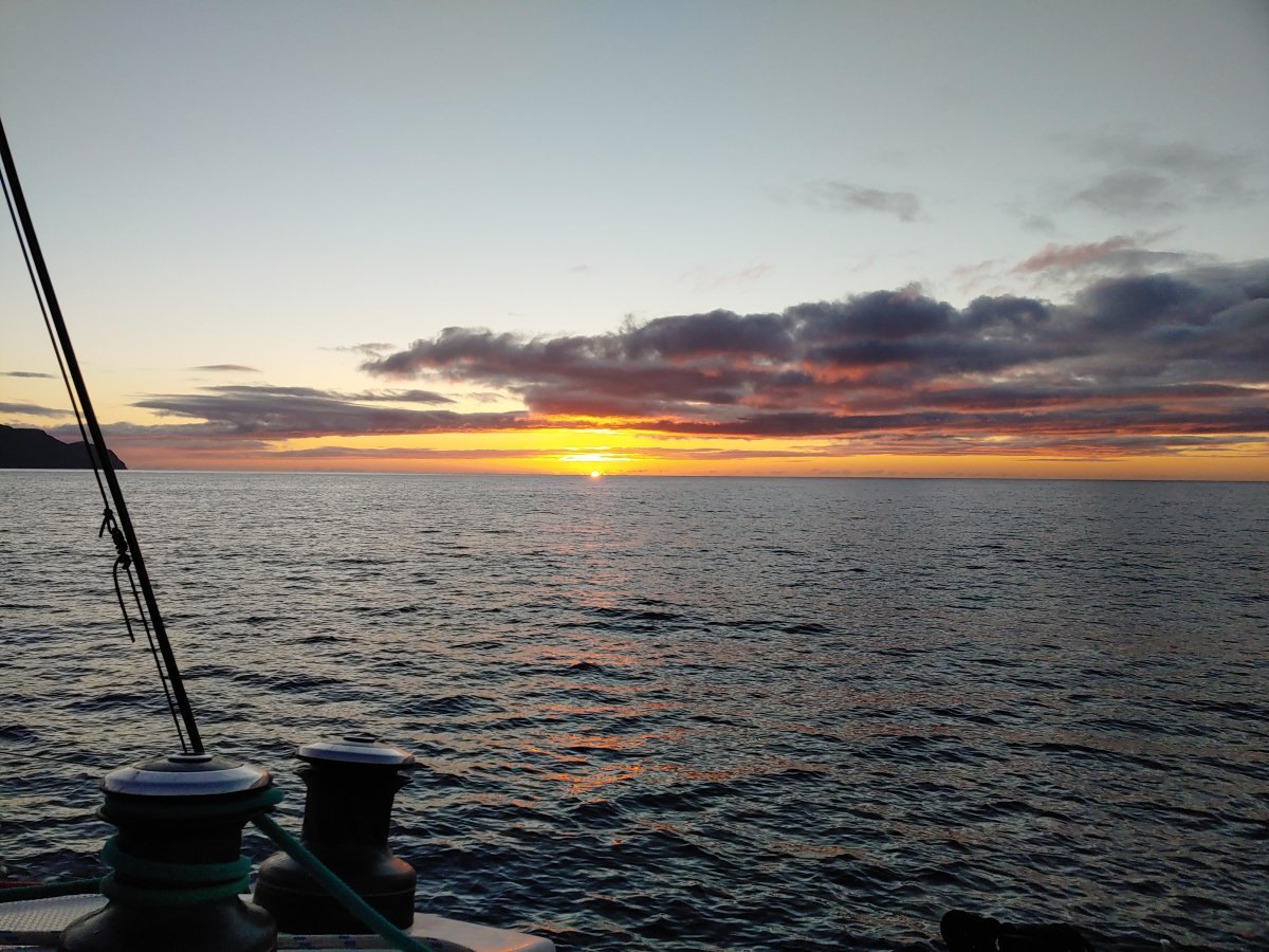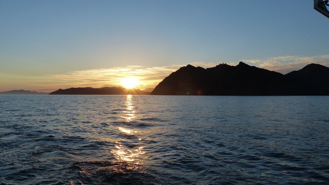 Am Samstagabend um 18:00 Uhr ging der Anker auf und ich fuhr los in Richtung Osten, erst einmal. Etwa 40 Minuten später, nachdem ich um das Cap mit Leuchtturm herum war, ging es dann nach Norden. Erst jetzt war es möglich, die Segel zu setzen und kurze Zeit später auch den Motor abzustellen. Unterwegs haben ein paar Angler meinen Weg gekreuzt und ein Feuerwehr-Boot ist hurtig an mir vorbeigezogen. Solange es noch hell war, konnte man am Ufer die eine oder andere Siedlung sehen. Nach Sonnenuntergang wurde es schon weniger interessant, denn alles war einfach nur noch schwarz. So dicht an der Küste im Dunkeln ist schon etwas unsicher, denn eine Boje oder Fischereizeugs, das auf dem Wasser treibt, kann man nicht sehen. In der Ferne kam in etwa 4 nm Mein Schiff 4 von TUI vorbei. Das war deutlich zu erkennen und über AIS konnte ich die Daten abrufen. In der Nähe des Flughafens haben mich mehrere Flugzeuge überholt und deren Landescheinwerfer sind schon beeindruckend.