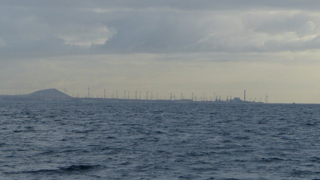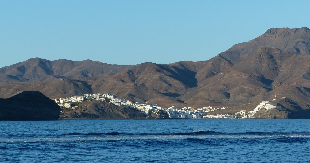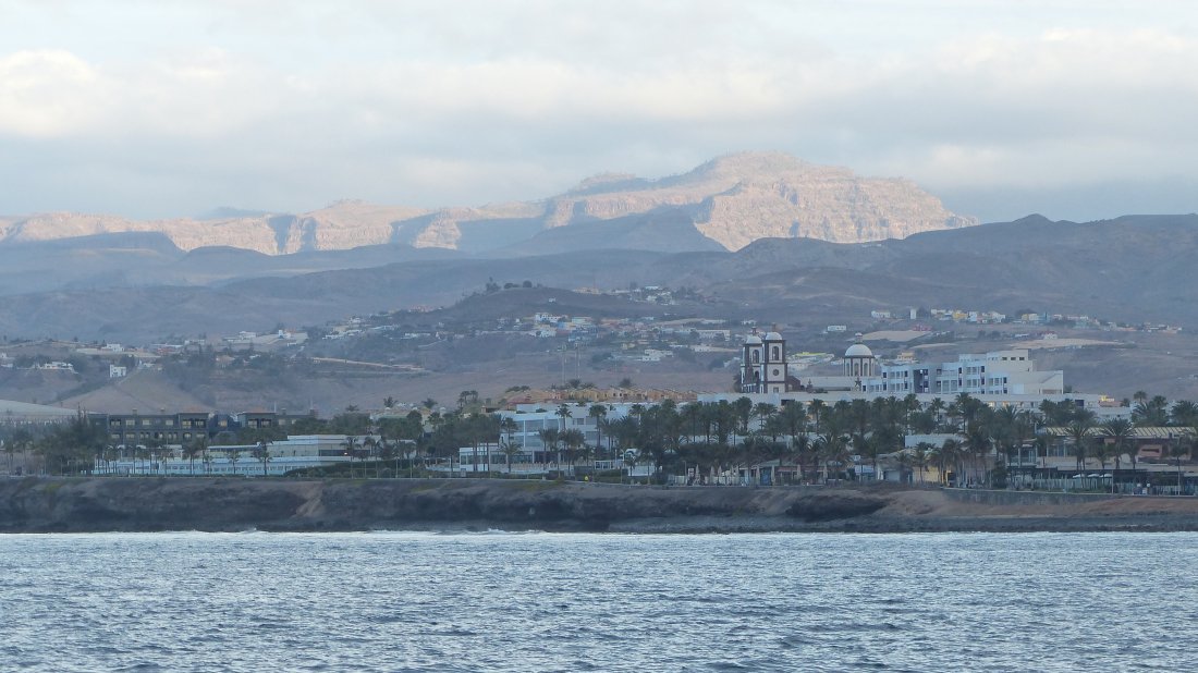 Die Fahrt am Montag nach Arinaga habe ich gestrichen. In meiner Vorhersage App kann ich auch einige Meßstationen sehen, die den tatsächlich vorhandenen Wind anzeigen. Diese Werte weichen manchmal erheblich von den prognostizierten Werten ab. So auch am Montag in Arinaga, statt der 14 kn Wind laut Vorhersage, gab es dort 21 kn mit Böen bis zu 32 kn. Das wollte ich mir nicht antun, also blieb nur der direkte Weg von Pasito Blanco nach Morro Jable. Laut Vorhersage sollte der Wind von Norden kommen, was ideal gewesen wäre und eine schnelle Reise erwarten ließ. Leider stimmte nur die vorhergesagte Windstärke in etwa, nicht die Windrichtung. Der Wind kam zu Anfang aus Nordost statt Nord und so mußte ich quasi einen Bogen fahren, anstatt direkt in Richtung Fuerteventura segeln zu können. Erst spät drehte der Wind langsam, aber die ganze Strecke über hatte ich den Wind mit ca. 35 Grad von vorne, statt wie erhofft von der Seite. Gegen den Wind zu segeln ist eben erheblich langsamer und so dauerte die Überfahrt statt der erhofften 11 – 12 Stunden länger als 16 Stunden. Ich bin um 7:30 aufgebrochen und 23:30 war ich auf der Höhe von Morro Jable. Im Dunkeln wollte ich nicht in eine unbekannte Bucht einlaufen, zumal ich durch das AIS sehen konnte, daß mindestens 5 Boote schon dort lagen. Auch das Bergen des Großsegels und Anker auslegen ist im Dunkeln nicht so einfach. Deshalb habe ich mich kurzerhand entschlossen direkt weiterzusegeln bis zum nächsten Ziel, Gran Tarajal. Dazu war genügend Zeit und ich brauchte mich nicht weiter anstrengen, nur eben wach bleiben. Der Wind hatte nachgelassen und so konnte ich ganz gemächlich, mit 3 – 4 Knoten und zwischendurch auch mal mit Motorunterstützung, die Küste Fuerteventuras entlang nach Norden segeln. Genau mit dem Sonnenaufgang kam ich an der Bucht von Gran Tarajal an. Nur ein Boot lag hier und so war das Ankern in der weiten Bucht kein Problem. Ich habe mich dann erst einmal schlafen gelegt.