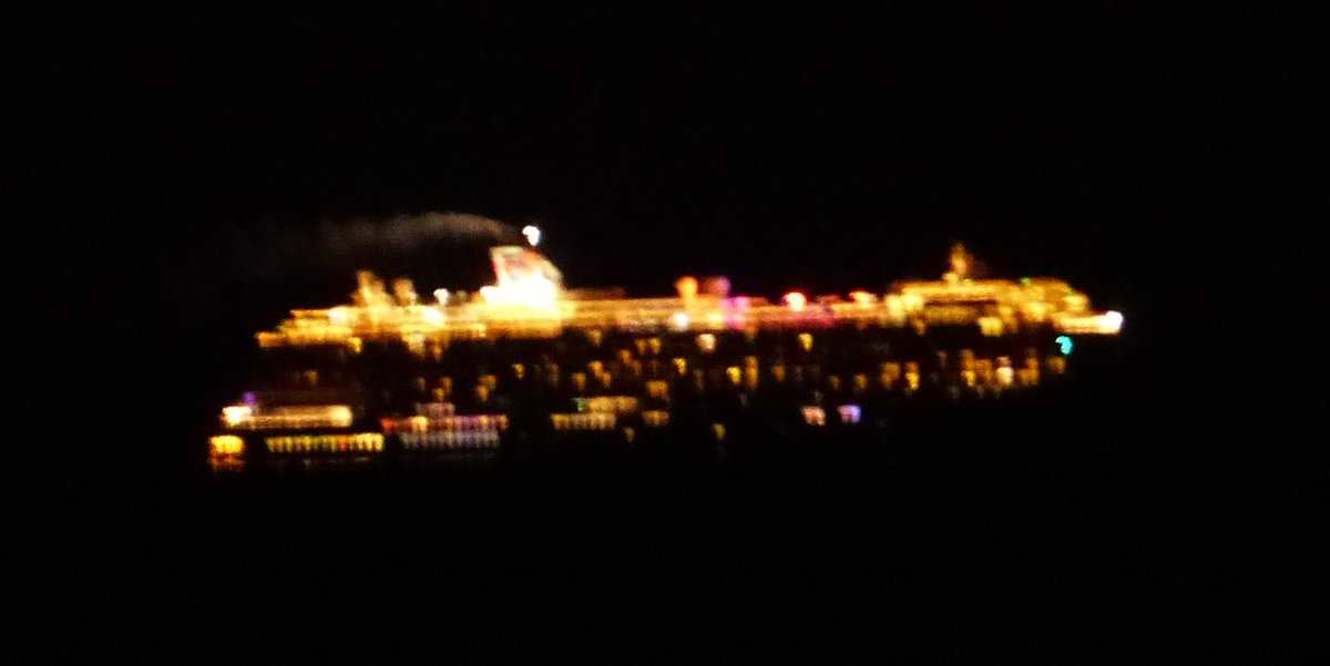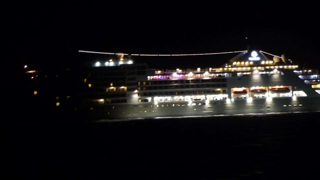 Als ich mich dem Hafen von Rosario genähert habe, hatte ich meine Schrecksekunde für die Nacht. Plötzlich gibt mein AIS eine Warnmeldung wegen Annäherung. Ich saß am Steuer, aber sah nichts außer den vielen Lichtern der Stadt und des Hafens. Als ich mir das auf dem Plotter-Bildschirm angeschaut habe, sah ich ein Passagierschiff mit 211 m Länge direkt auf mich zu haltend, das mich auf meiner Backbordseite passieren würde. Es war nur noch 1 nm entfernt. Wieder am Steuer sah ich immer noch nichts, aber ich bin nach Steuerbord ausgewichen. Auf dem Bildschirm konnte ich sehen, daß der Passagierdampfer auch ein wenig nach Backbord auswich. Erst als ich das Schiff leicht von der Seite sehen konnte, etwa 800 m vor mir, konnte ich es mit seiner Beleuchtung erkennen. Von vorne gesehen war das Schiff zu dunkel, um sich von der Hintergrundbeleuchtung der Stadt abzuheben. Ich konnte deutlich die Heckwellen des Passagierschiffs am Boot spüren.