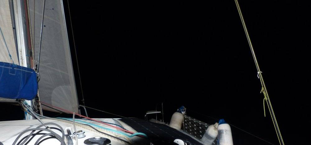 Der Rest der Nacht blieb ereignislos und ich konnte mit dem Wind ganz gemütlich bis ans nördliche Ende von Fuerteventura segeln. Leider war mit dem Ende von Fuerte auch das Ende der Gemütlichkeit erreicht. Zwischen Lanzarote und Fuerteventura steigerte sich der Wind mit jeder Meile, was nicht der Vorhersage entsprach. Ich mußte die Segel reffen und alleine ist das jedes Mal ein Kraftakt, zumal ich dazu auf dem inzwischen stark schwankenden Boot nach vorne an den Mast mußte und es stockfinster war.