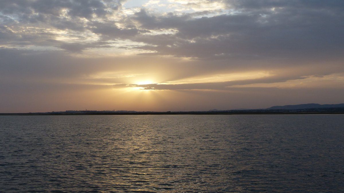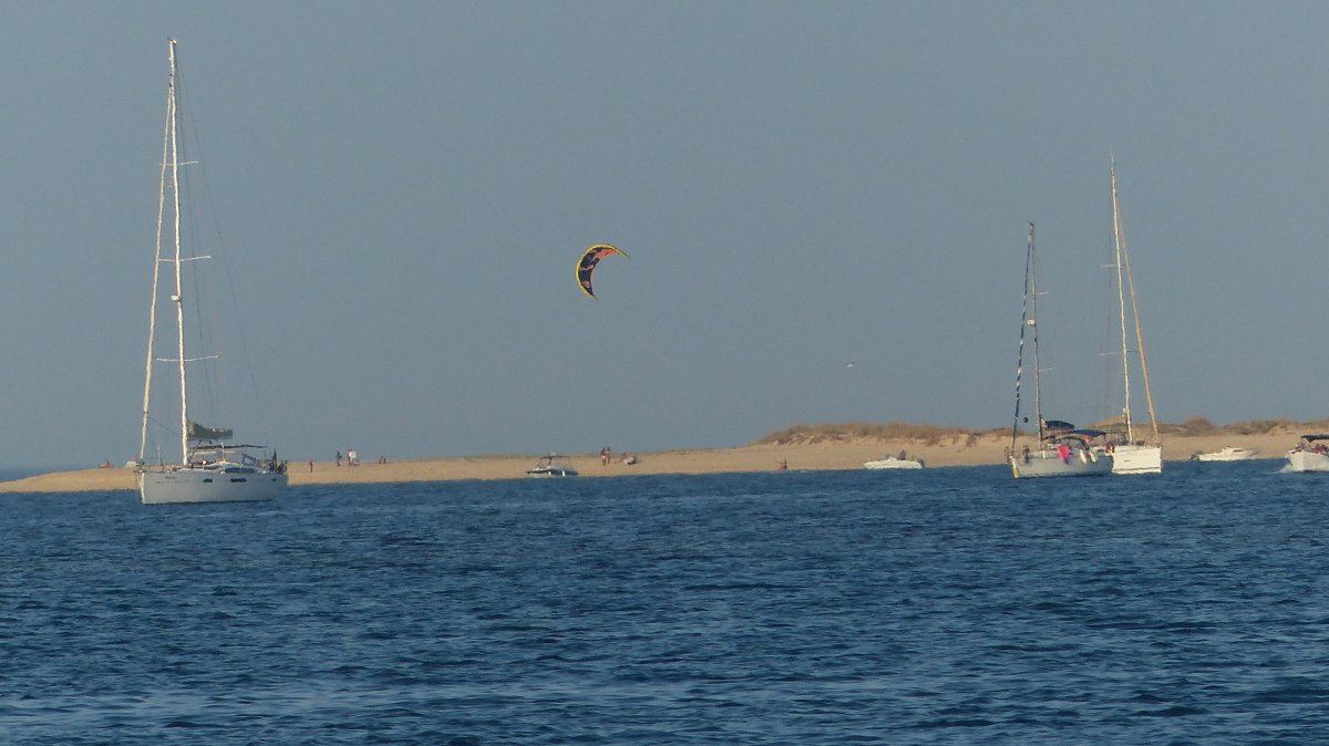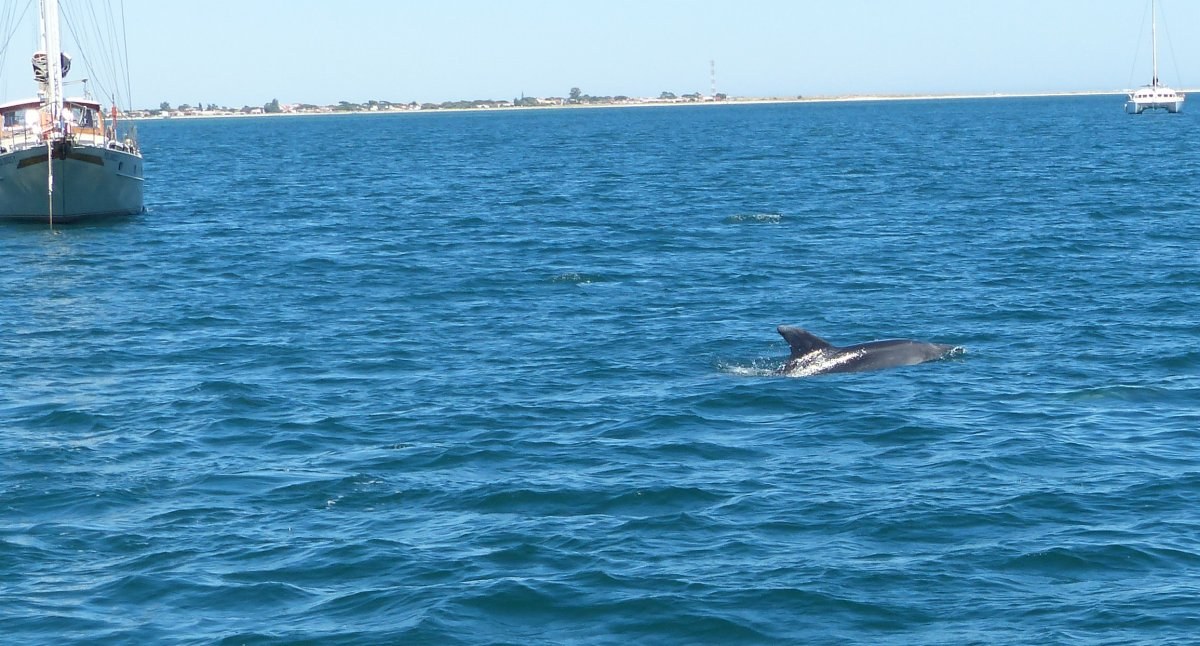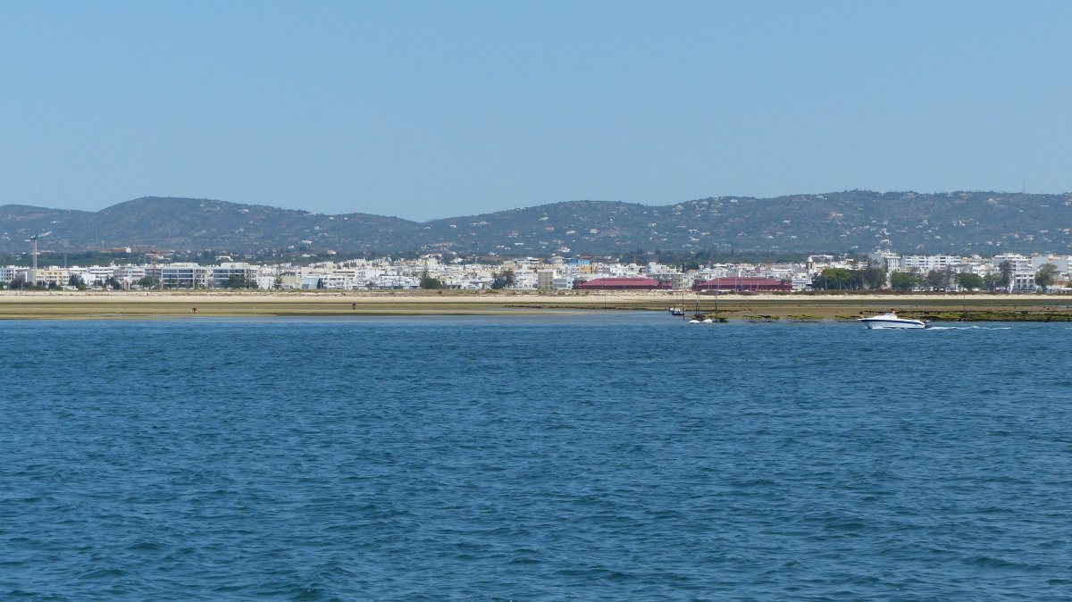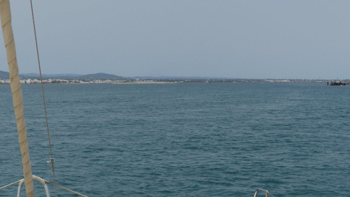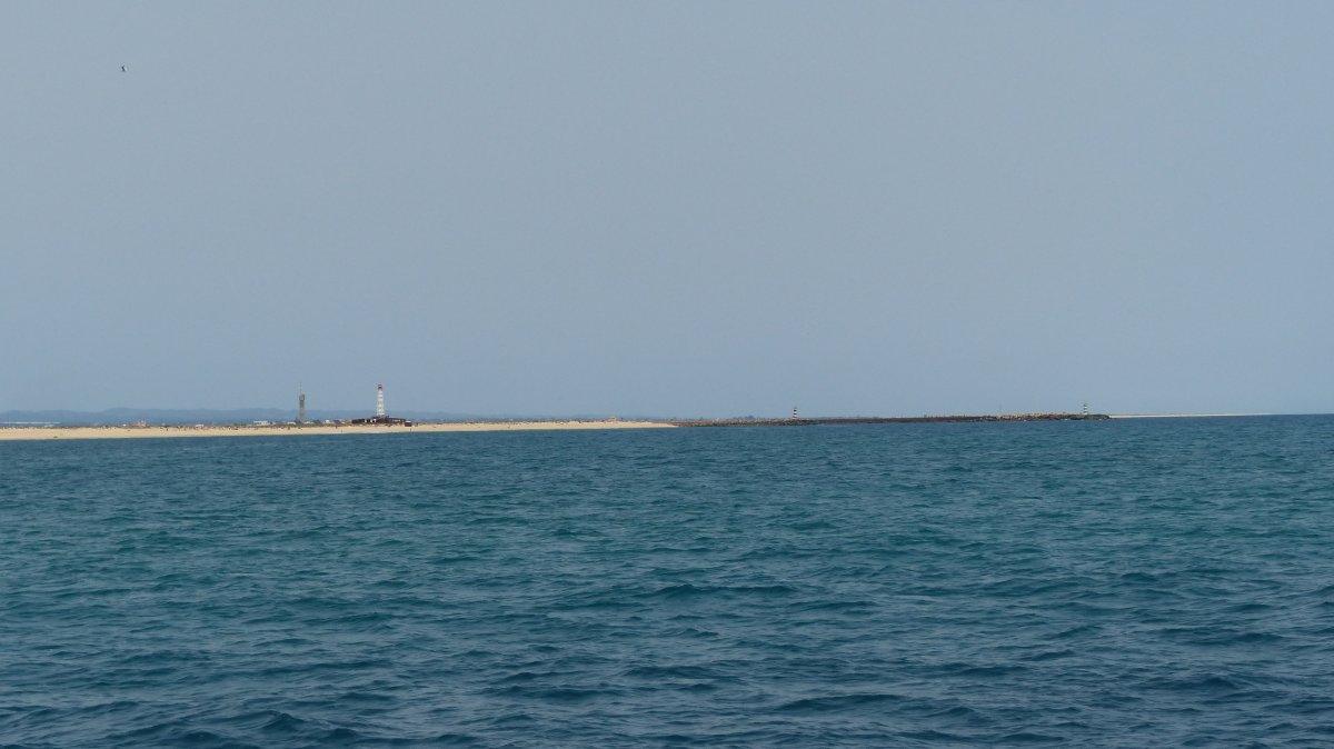 Auch die 2. Etappe, von Albufeira nach Culatra, verlief ohne nennenswerte Ereignisse. Ich fuhr mit Motor gemütlich die Küste entlang nach Osten und die Genua unterstützte dabei ein wenig den Motor. Zum reinen Segeln war nicht genügend Wind. Mit der Annäherung an Faro war deutlich zu sehen, wie sich die Küstenlinie veränderte. Die steilen Felsen mit ihren Höhlen verschwanden und stattdessen sah man Sandstrände. Kurz nach 14 Uhr kam die Einfahrt in die Lagune in Sicht, in der Culatra auf einer Sandinsel liegt.