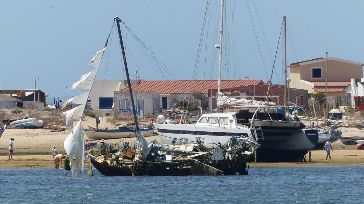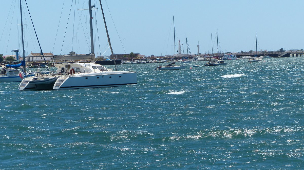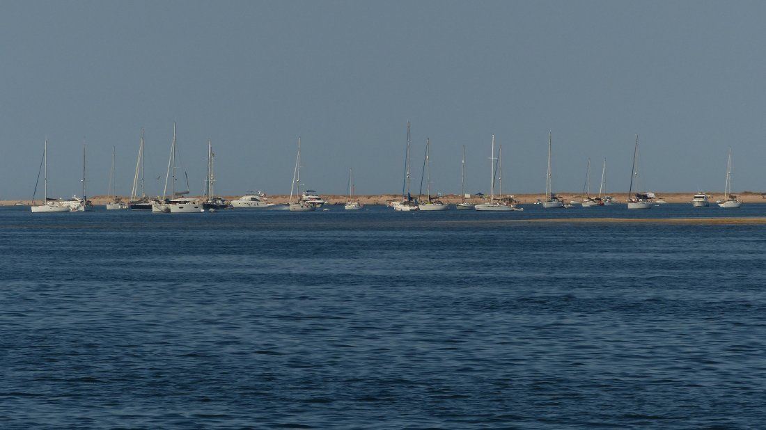 Die große Wasserfläche ist trügerisch, denn es gibt eine Fahrrinne, in der man sich halten muß, sonst besteht die Gefahr auf einer Sandbank aufzulaufen. Vor Culatra ankerten bereits an die 40 Boote und ich suchte mir einen Ankerplatz am Ende des Felds, hinter der Hafeneinfahrt. Der Wind hatte inzwischen aufgefrischt und so wurde ich beim Ankermanöver ein wenig weiter abgetrieben als ich es wollte, aber das ist nicht weiter tragisch. Auf ein paar Meter kommt es hier nicht an. Wenn es mal wieder ruhiger ist in den nächsten Tagen, verlege ich mich noch ein wenig weiter nach Vorne. An der aktuellen Stelle habe ich bei Ebbe nur etwas über 1,2 m Wasser unterm Kiel, das würde ich gerne etwas erhöhen und weiter vorne ist es etwas tiefer.