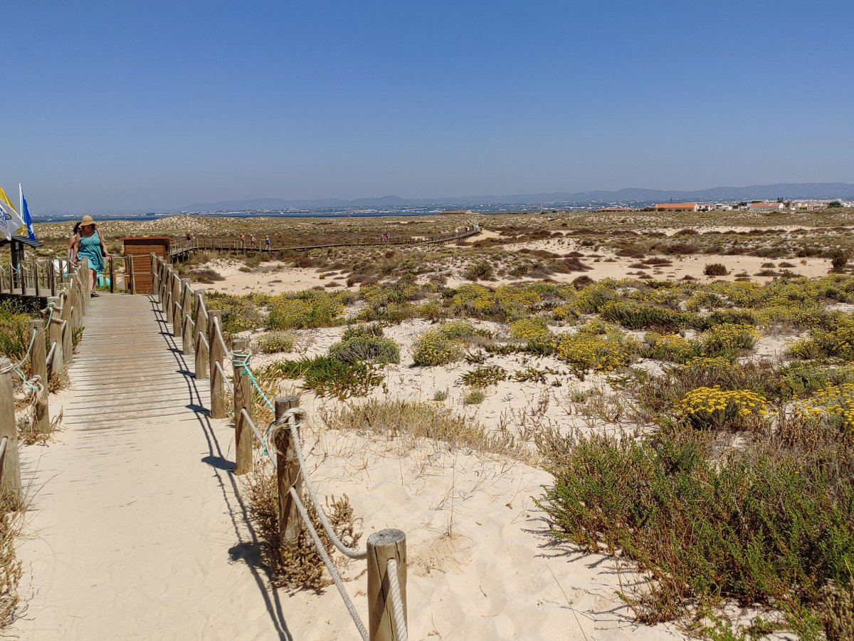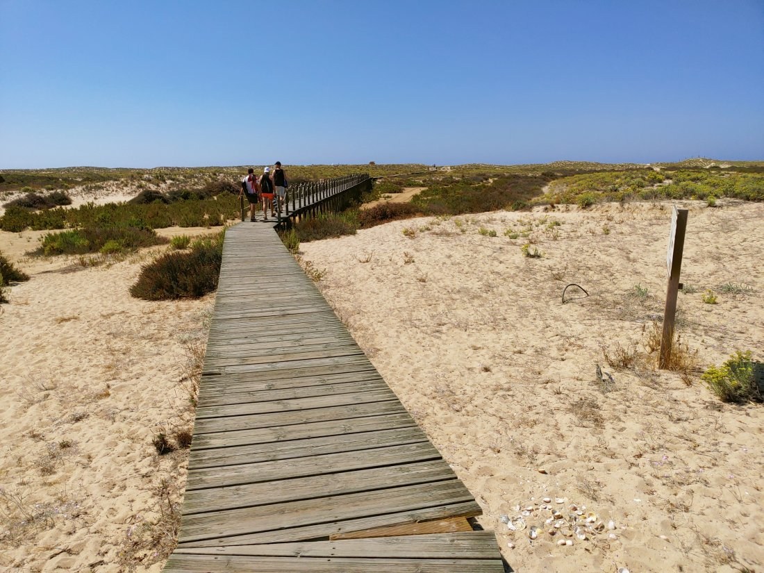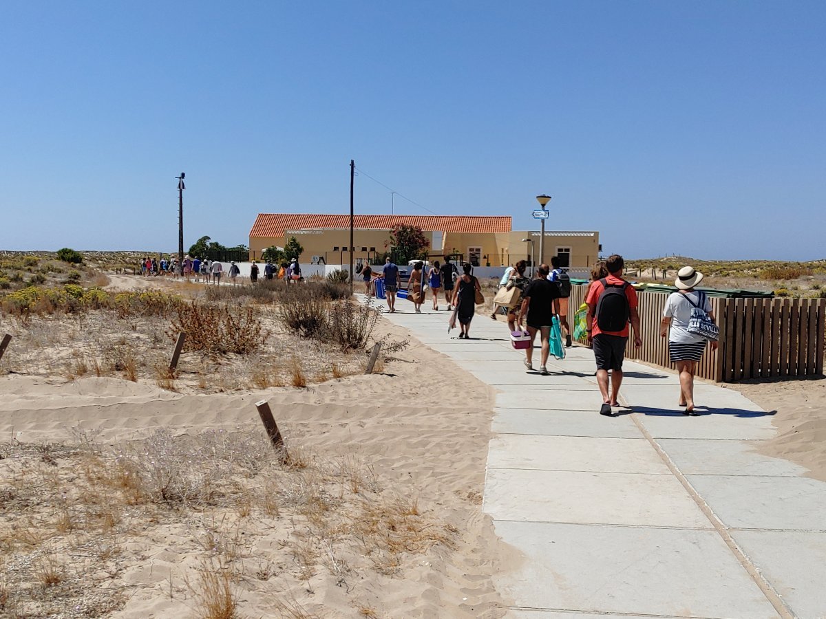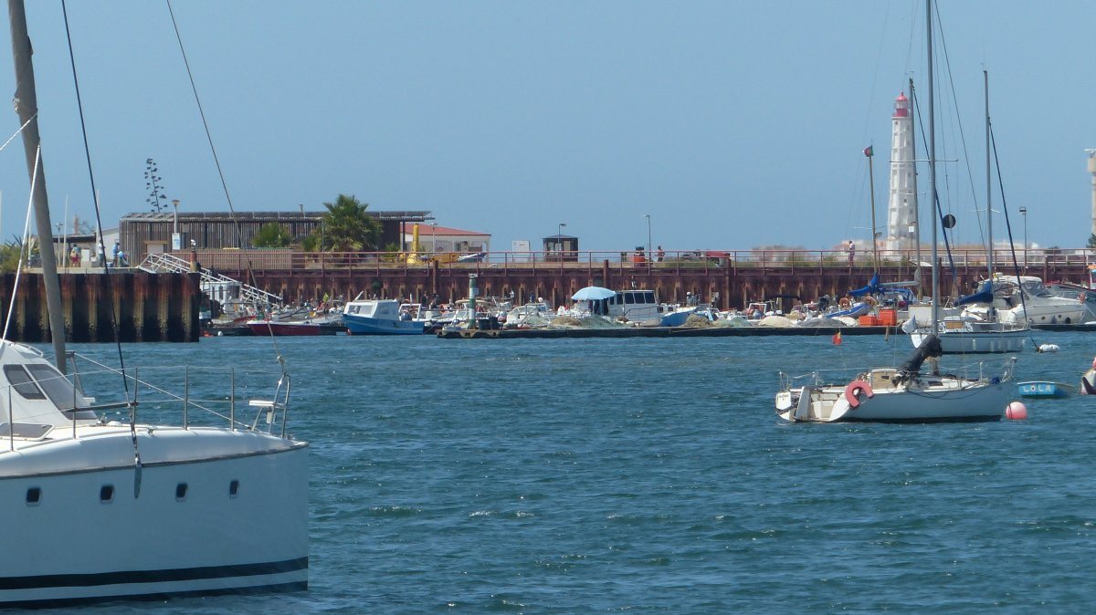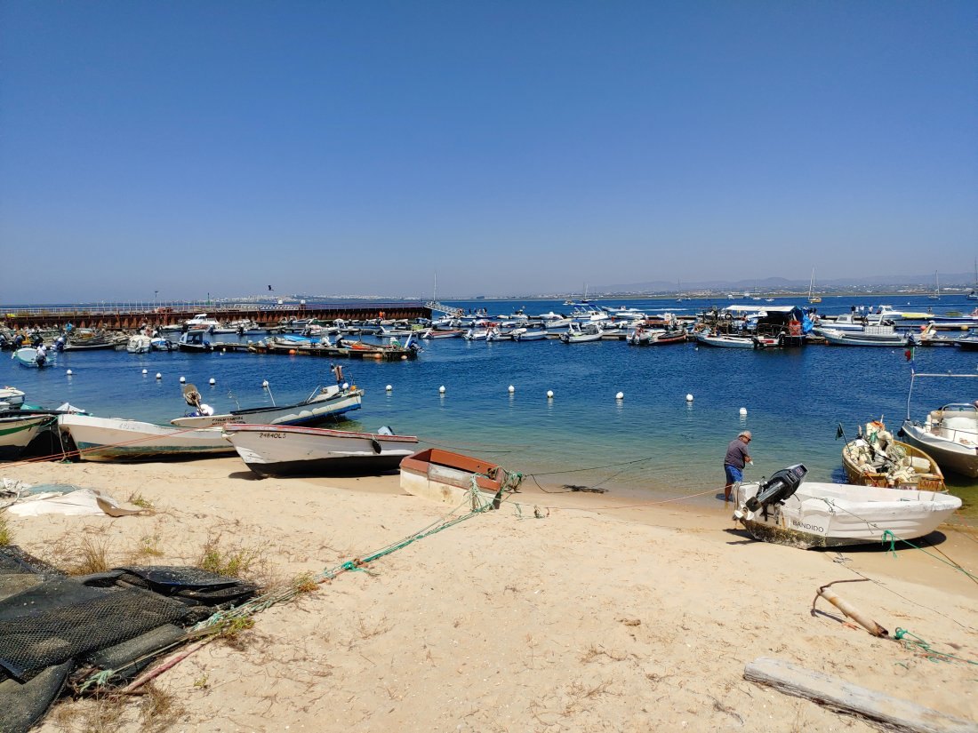 Die Insel besteht, ähnlich wie Fraser-Island in Australien, nur aus Sand, allerdings ist sie um einiges kleiner. Die spärliche Vegetation auf den Dünen hält die Insel quasi zusammen und um sie zu schützen, gibt es Stege, um sie auf dem Weg zum Strand zu überqueren. Im Dorf selbst gibt es ein paar Cafés, ein oder zwei Supermärkte und einige Souvenirläden, soweit ich sehen konnte. Der Hauptweg führt direkt von der Marina durch den Ort zum Steg durch die Dünnen bis zum Strand. Das ist auch das Ziel der Leute, die mit den Fähren vom Festland, Olhao oder Faro, hier ankommen. In der Lagune selbst ist es übrigens nicht so toll zu schwimmen, das Wasser ist recht trübe und mit allerlei Treibgut versetzt. Am Strand, direkt am Atlantik, ist das Meer wesentlich klarer und sauberer. Hier ist man durchaus auf die Touristen eingestellt und es gibt auch eine Rettungsstation.