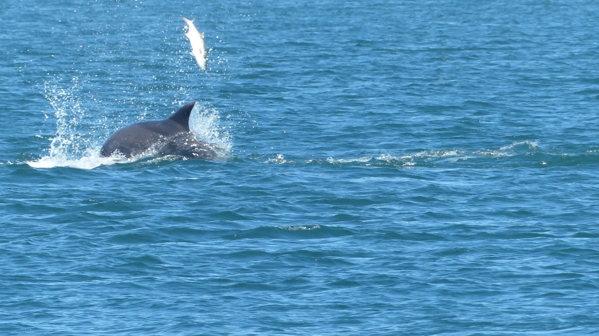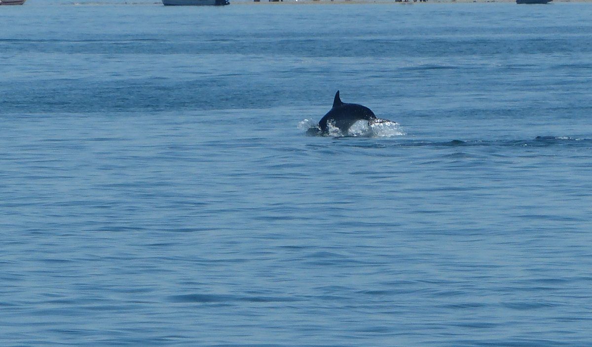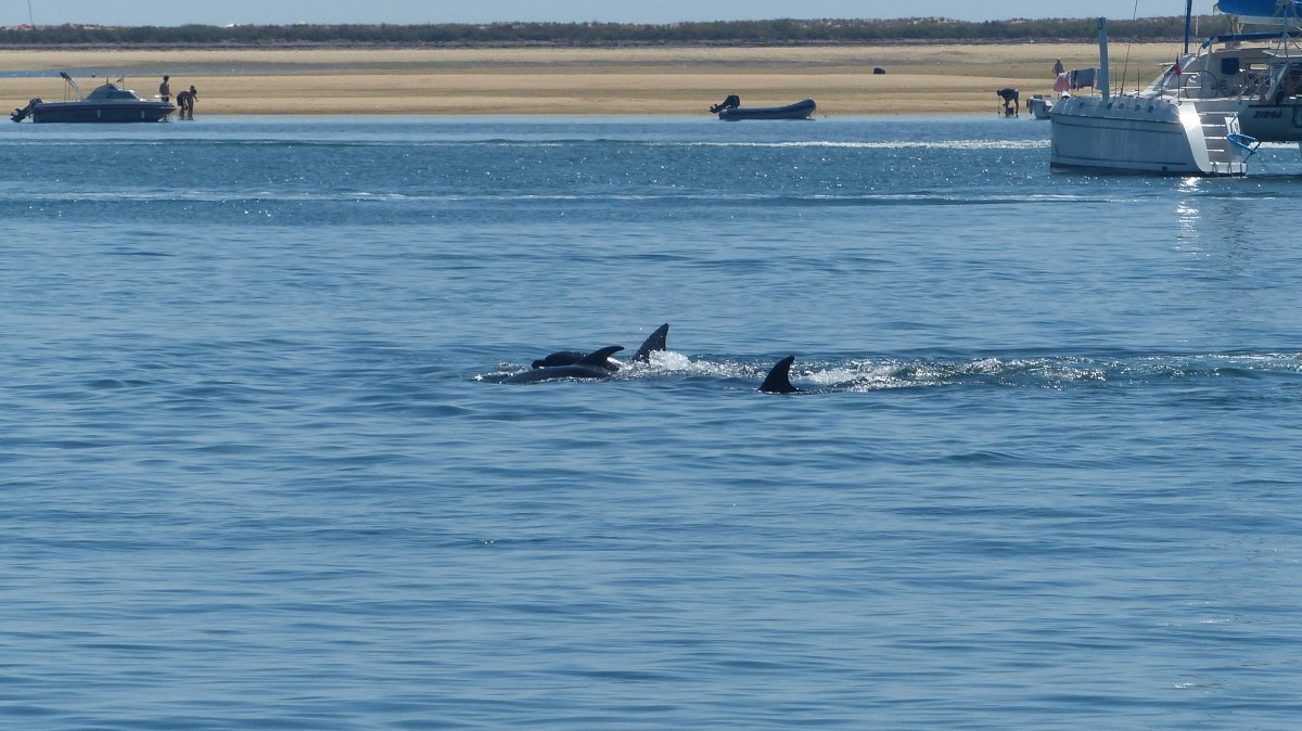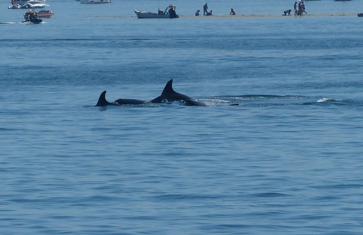 Sie waren wieder auf der Jagd im flachen Wasser, es war gerade Ebbe. Für nicht einmal 10 Minuten sind sie in der Nähe herumgeschwommen und waren immer wiederzusehen, aber die kleinen Motorboote und Jetskis sind ihnen sehr dicht gefolgt und plötzlich war nichts mehr von ihnen zu sehen.