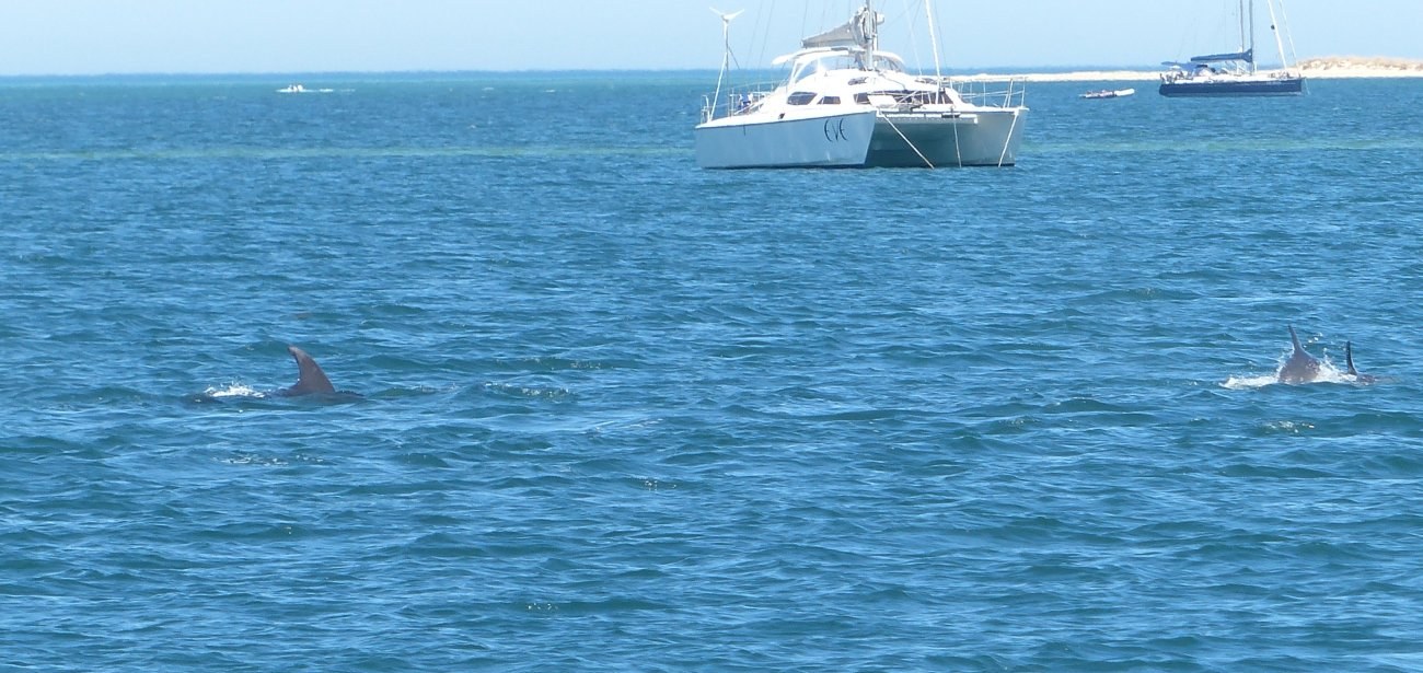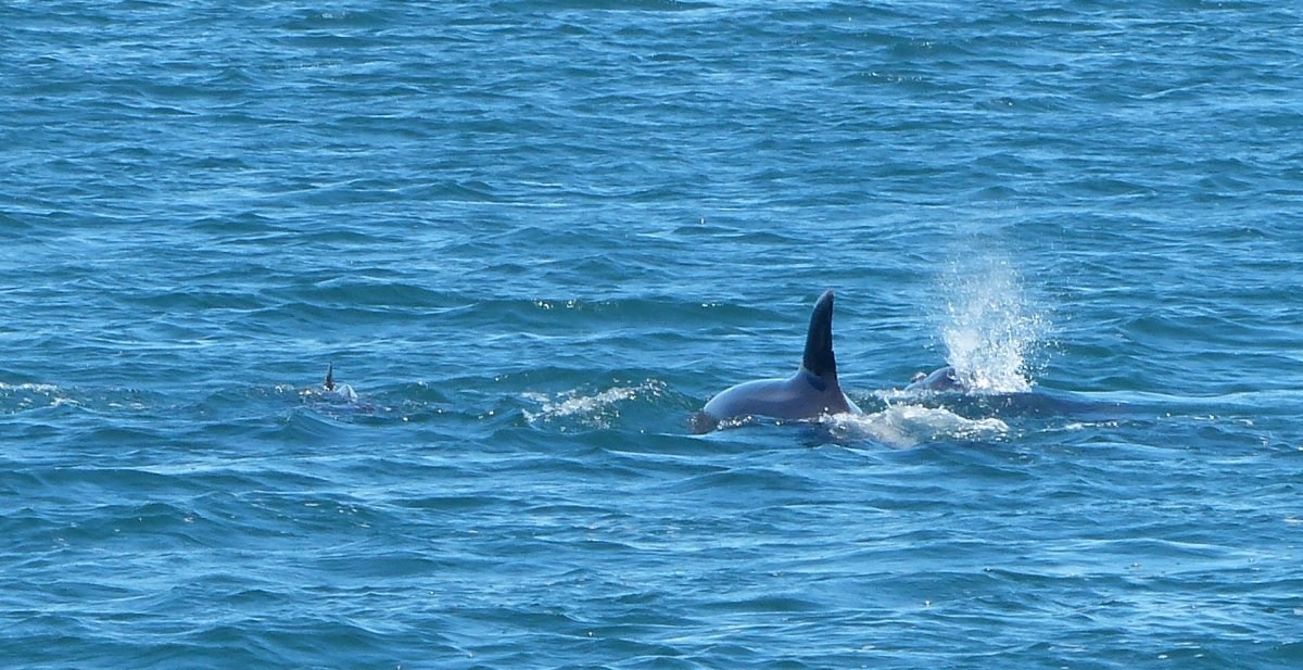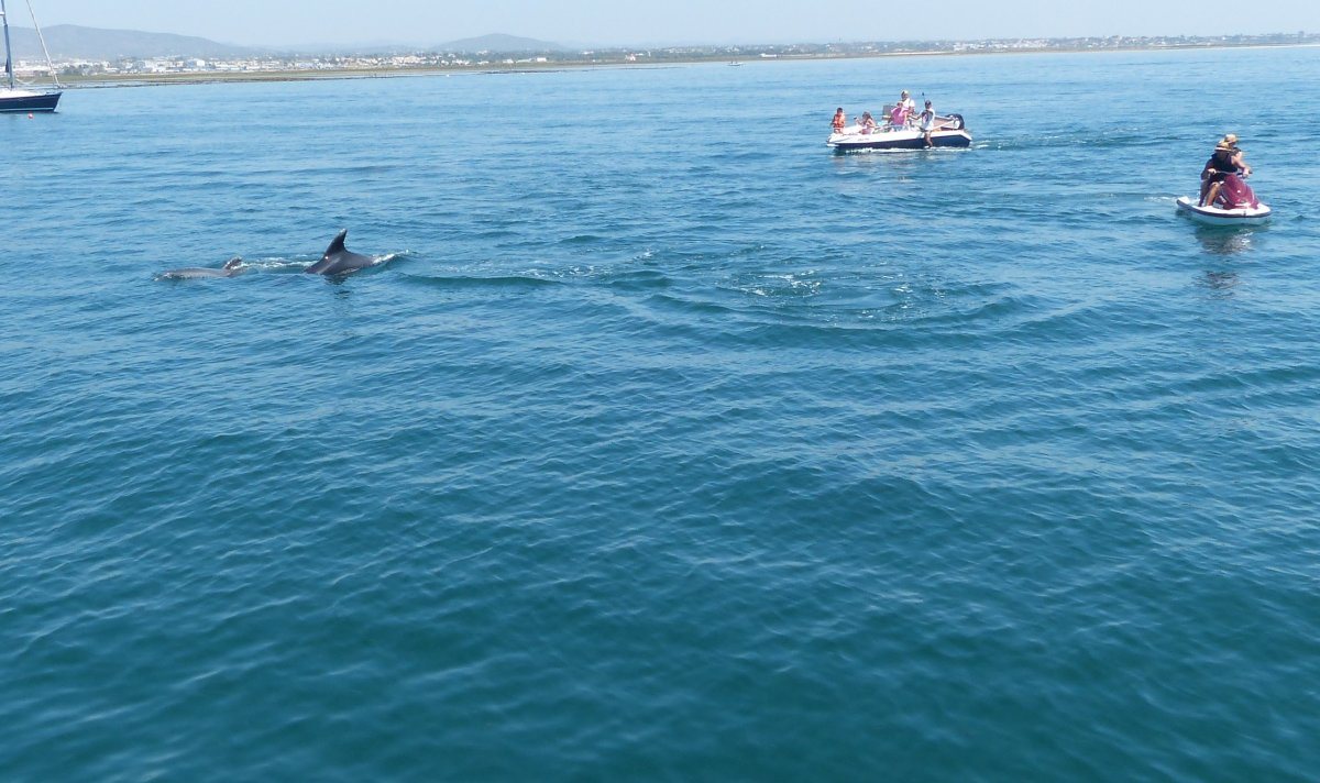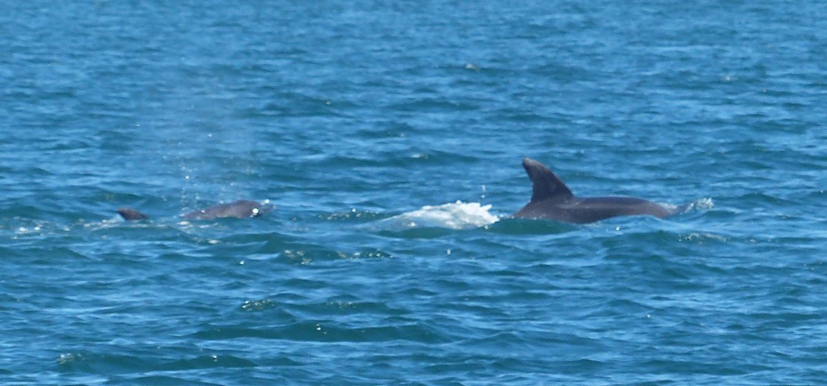 Sie waren wieder auf der Jagd im flachen Wasser, es war gerade Ebbe. Für nicht einmal 10 Minuten sind sie in der Nähe herumgeschwommen und waren immer wiederzusehen, aber die kleinen Motorboote und Jetskis sind ihnen sehr dicht gefolgt und plötzlich war nichts mehr von ihnen zu sehen.