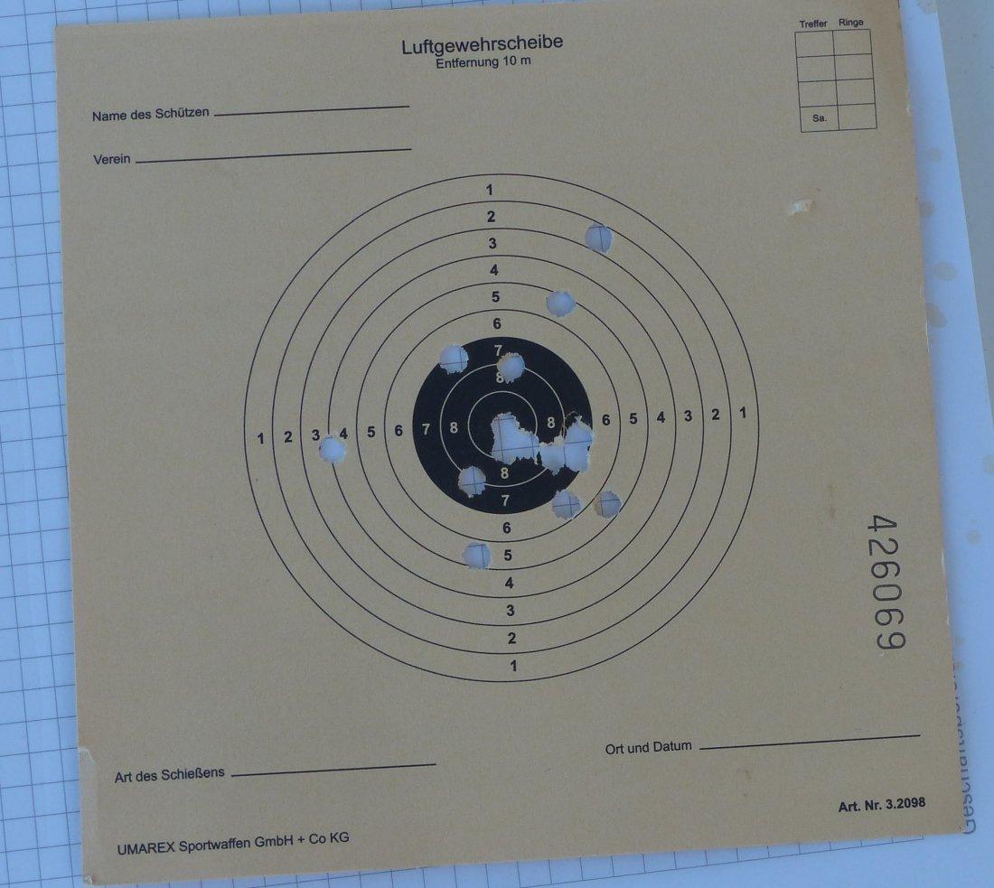 Um für Abwechslung vom Lesen zu sorgen, habe ich mal meine Luftpistole herausgesucht. Hier auf dem Wasser störe oder gefährde ich ja niemanden. Das Ergebnis, denke ich, kann sich sehen lassen, es ist schließlich ein schwankender Untergrund.
