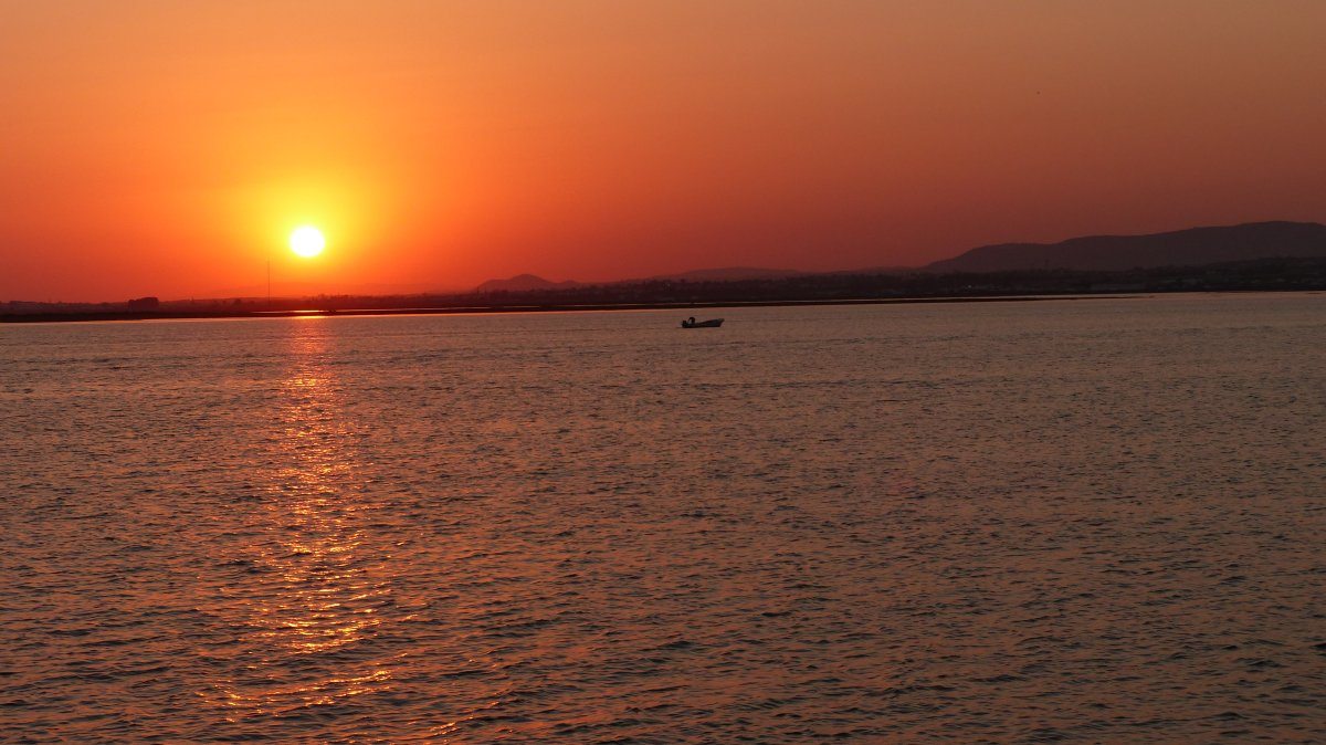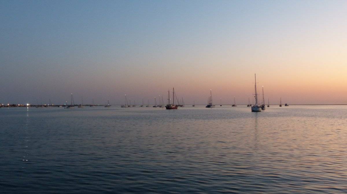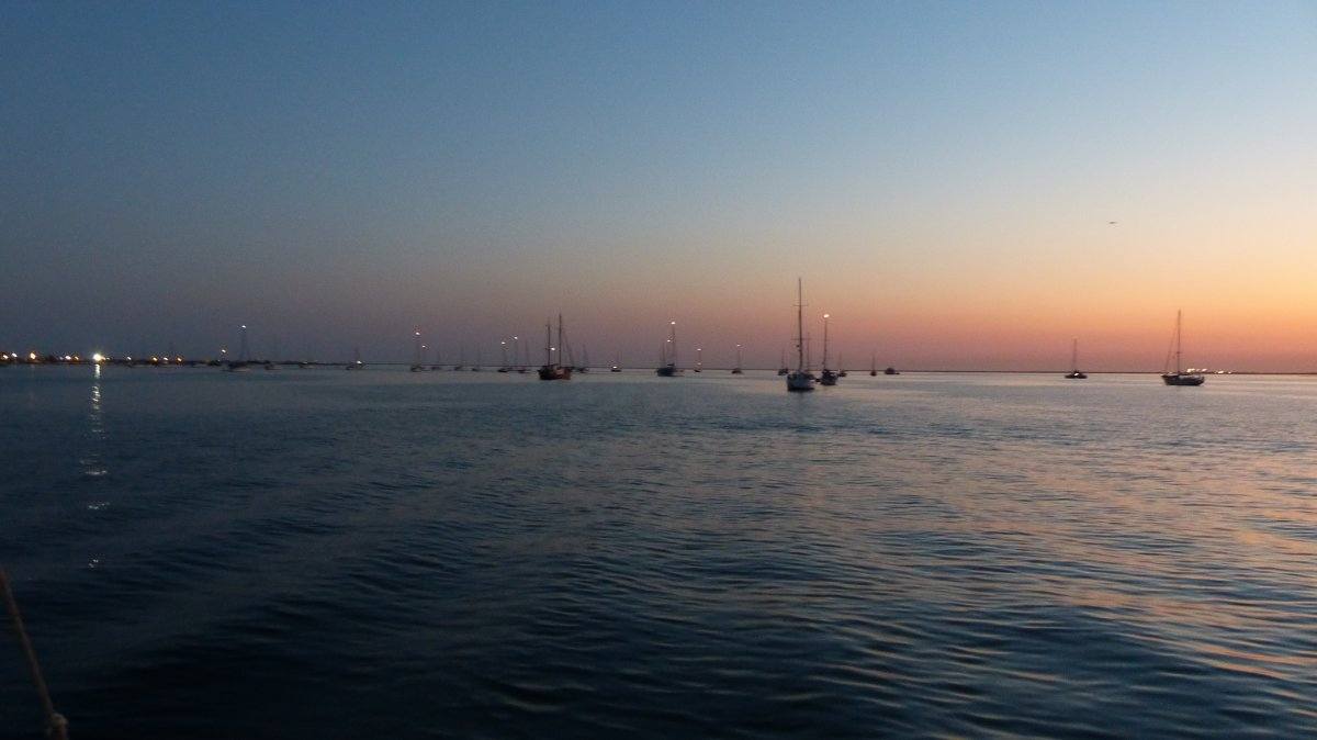Kurz nach 17 Uhr ließ ich in der Bucht von Albufeira den Anker fallen. Bis auf ein Motorboot, das kurze Zeit später verschwand, war die Bucht leer. Abgesehen natürlich von den Spaß-Booten, die Gummiringe hinter sich herzogen, den Jetskis und den Ausflugsbooten, die in die Marina hinein oder herausfuhren. Aber inzwischen ist die Sonne untergegangen und es ist kein Boot mehr unterwegs.