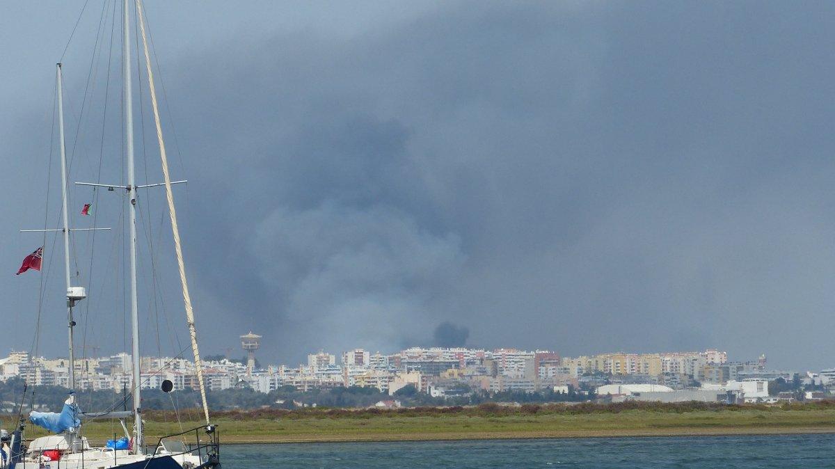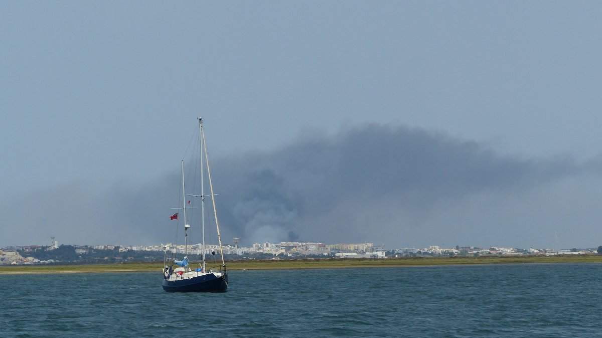 Seit Dienstagnacht, kurz vor Mitternacht, wütet ein Waldbrand nordwestlich von Faro. Die Rauchsäule über der Stadt ist nicht zu übersehen. Bisher habe ich noch Glück, der Wind treibt den Rauch und die Asche aufs Meer nach Westen. Ich hoffe, der Brand kann bald gelöscht werden, denn wenn der Wind drehen sollte, kann das auch hier auf dem Wasser sehr unangenehm werden, mit dem Rauch und der Asche. Laut Vorhersage besteht heute eine geringe Wahrscheinlichkeit für Regen. Eines der wenigen Male, die ich auf Regen hoffe.