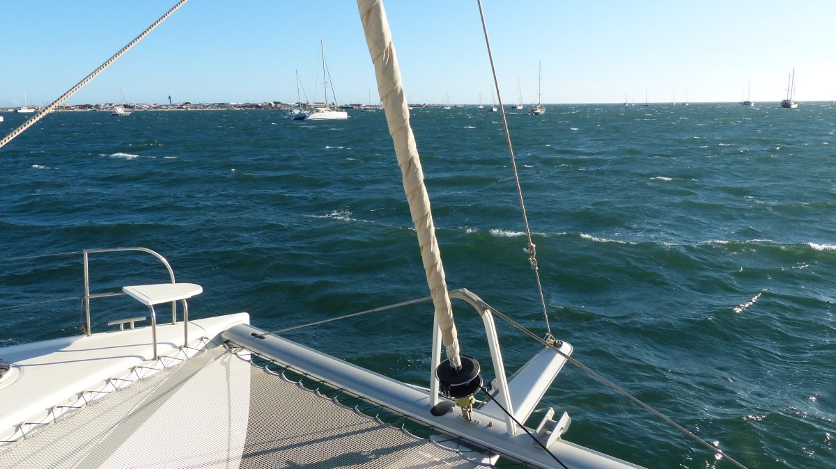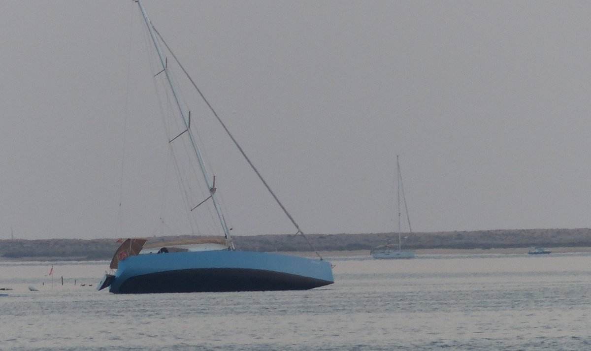 Gestern Abend ist mir ein Boot aufgefallen, dessen Skipper sich mit der Wassertiefe wohl etwas vertan hat. Es muß auf einer Sandbank stecken geblieben sein und dann, bei einsetzender Ebbe, hat es sich auf die Seite gelegt. Bei einem Monohull kann das fatale Folgen haben, schlimmstenfalls gibt es Risse im Rumpf. Bei einem Katamaran wie meinem würde nicht viel passieren, ich müßte nur warten bis das Wasser wieder steigt.