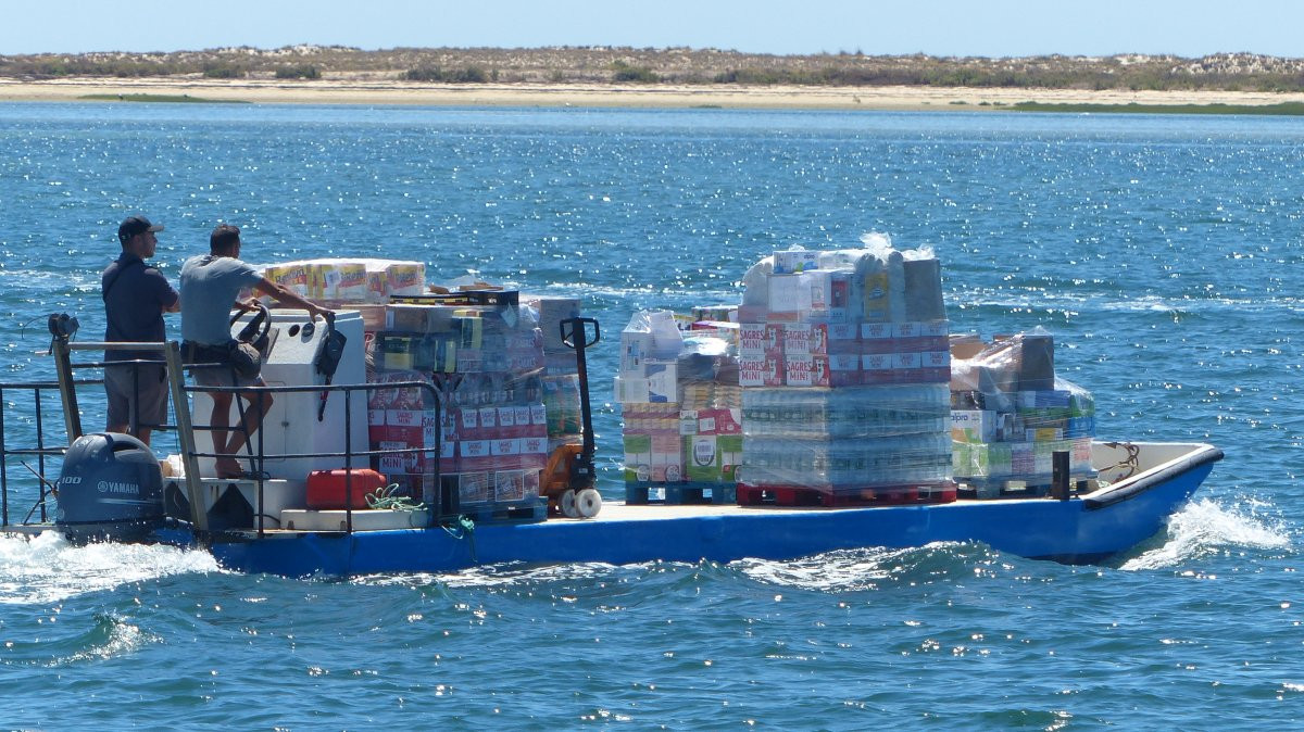 Inzwischen ist hier ein Boot unterwegs, das Frischwasser liefert. Ich hatte davon gelesen, aber es erst jetzt tatsächlich gesehen. Falls mir also doch noch das Wasser ausgehen sollte, gibt es Nachschub ohne daß ich in eine Marina muß.