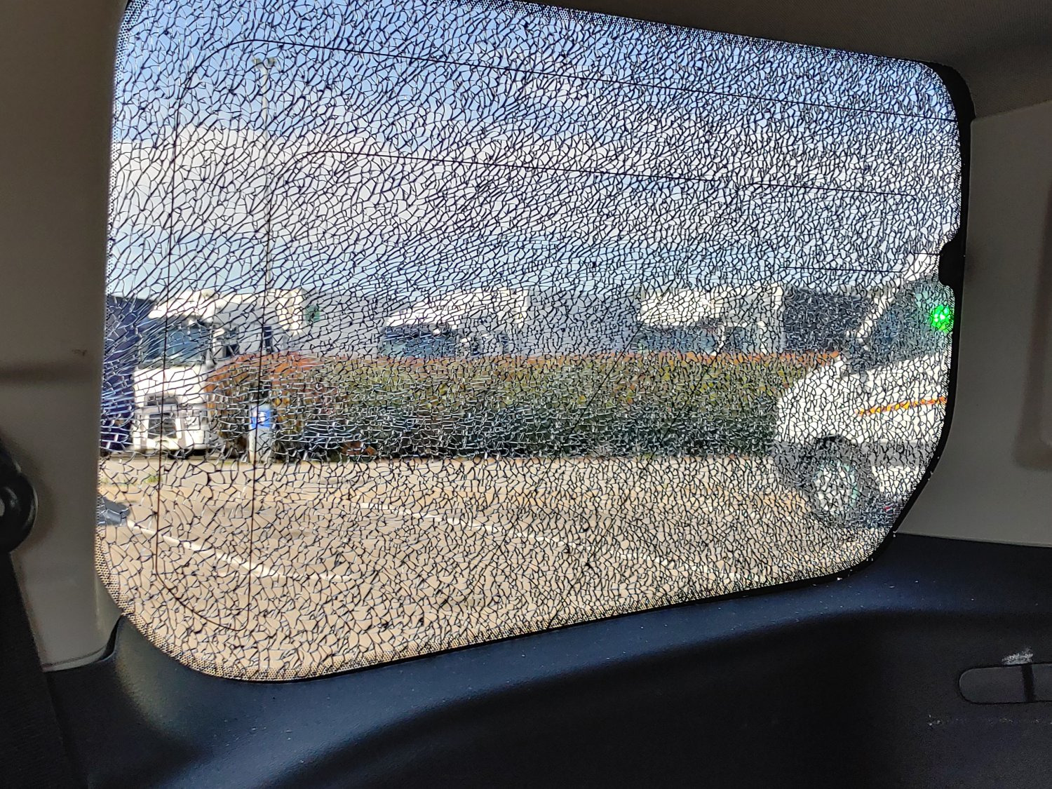 Um genügend Ladekapazität zu haben, meinen Hausstand von der Mephisto in mein noch zu findendes Apartment zu schaffen und nächstes Jahr zurück nach Mannheim, hatte ich mir einen Ford Grand Tourneo Connect gekauft. In dem konnte ich nun auf dem Weg nach Almerimar auch bequem schlafen. Leider überstand er die Fahrt nicht unbeschadet. Kurz nach Überqueren der Französisch-Spanischen Grenze, überholte ich einen LKW, der mit seinen Reifen etwas aufwirbelte, das meine hintere Seitenscheibe splittern ließ. Ich hörte zunächst nur einen dumpfen Schlag und erst viel später entdeckte ich die gesplitterte Scheibe. Glücklicherweise hielten die Splitter noch zusammen und ich konnte ohne weitere Beeinträchtigung zunächst weiterfahren.