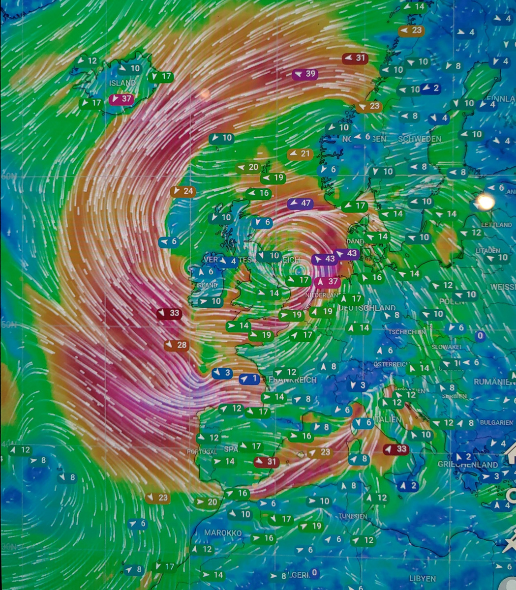 Besonders heftig war es gerade vorgestern, Donnerstag. Ich habe leider keinen Windmesser mehr zur Verfügung, aber es waren 50 kn Wind vorhergesagt und ich denke, die hatte es auch. Im Garten vor meinem Balkon hat es gleich zwei Bäume umgeknickt und als ich gestern an der Strandpromenade entlang lief, konnte ich mehrere Schilder am Boden liegen sehen, vom Wind umgedrückt oder abgebrochen. Der Weg zum Supermarkt war anstrengend, ich mußte regelrecht gegen den Wind ankämpfen.