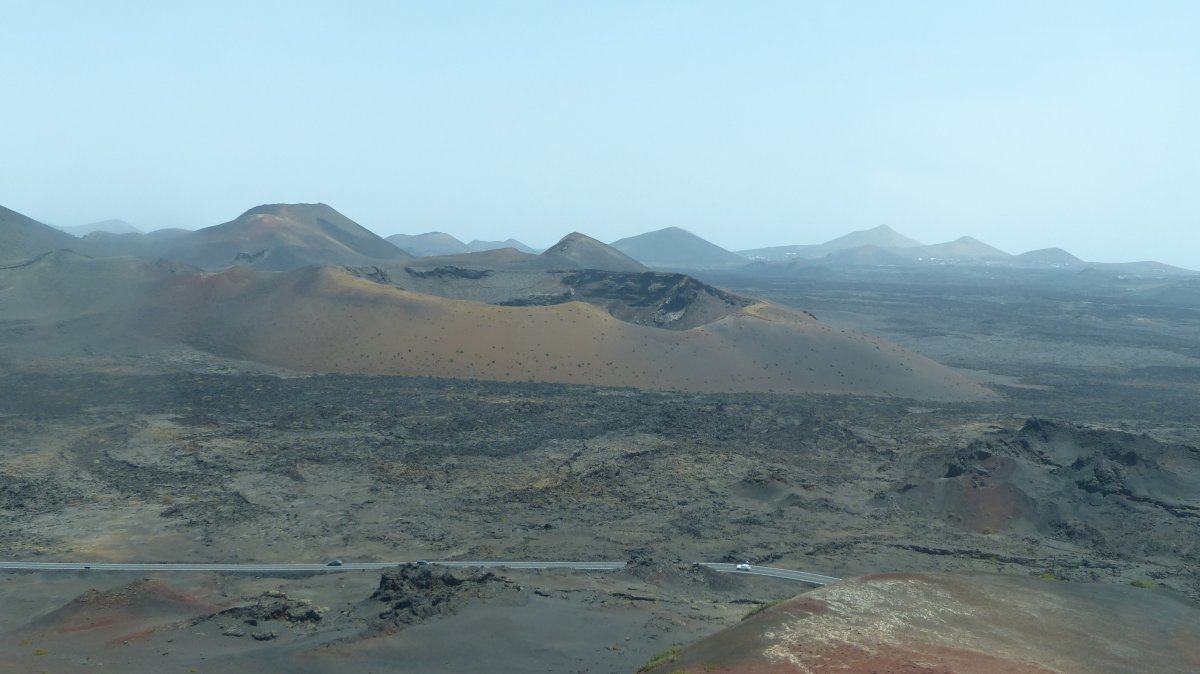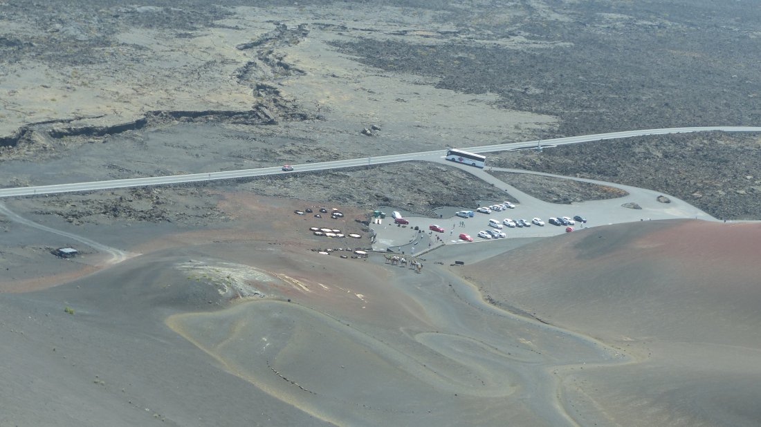 Als Nächstes kamen wir dann in den Nationalpark Timanfaya. Direkt nach der Einfahrt staute sich der Verkehr, aber der Bus fuhr einfach an der Schlange vorbei. Die privaten Besucher mußten warten, bis auf dem Parkplatz an der Besucherstation wieder Platz zum Parken war, etwa eine Stunde. Der Reiseführer meinte, es wäre nur wegen Ostern so voll.